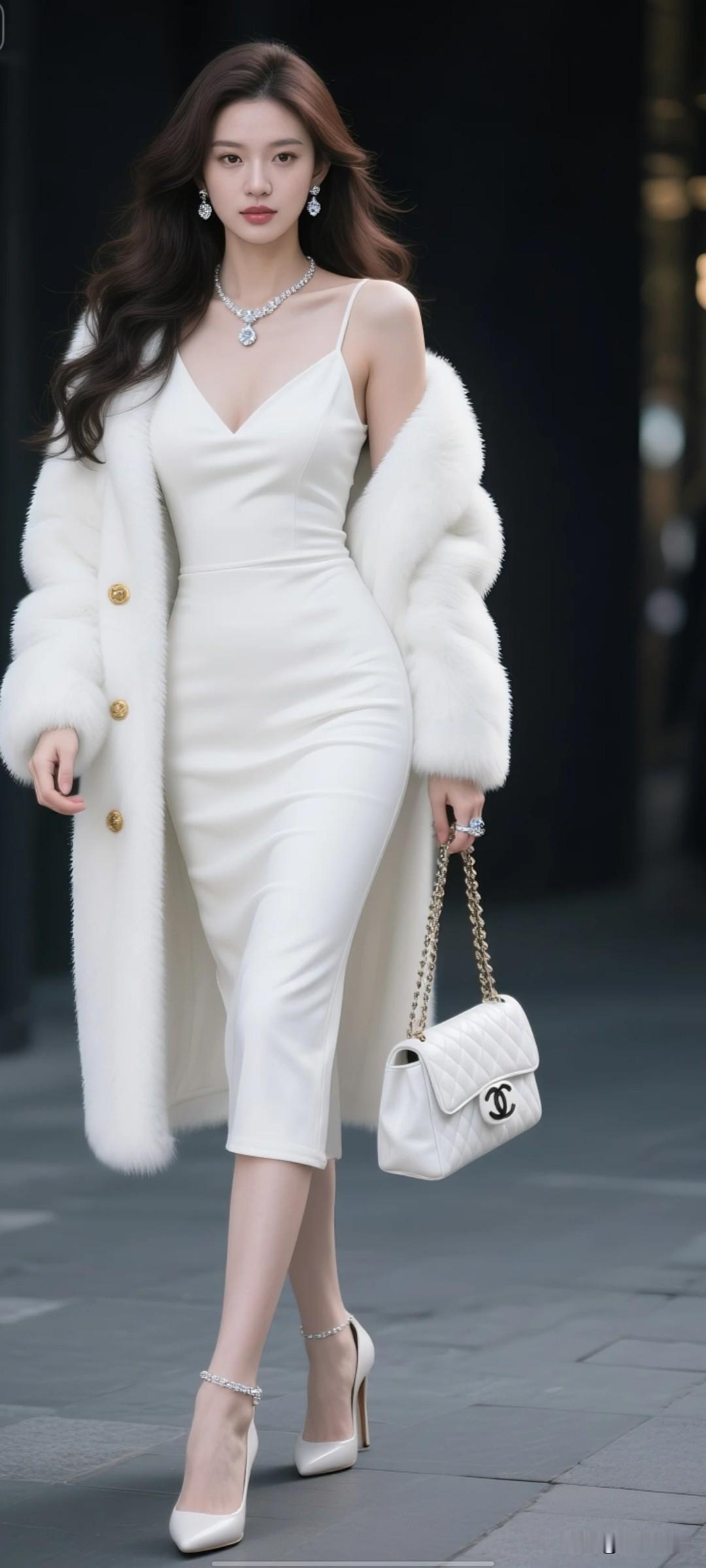 女生留着黑色长发披肩顺滑,身穿奶油色皮草外套,黑色紧身牛仔裤,黑色长筒高跟皮靴,斜挎老花色色皮包。 背景呈现出电影写真风格,展现出北国风光的雪景,在一片银白的世界中,有古色古香的亭台楼阁矗立着,屋顶与地面都覆盖着厚厚的积雪,红梅树木的枝丫上也挂满了晶莹的雪。画面色调大胆,以纯净的白色为主调,点缀着红梅的艳丽色彩,形成鲜明对比,光影的运用使得雪景更加富有层次感。少女风写真照 vlog打卡每日穿搭 什么身材的人适合包臀长裙呢?