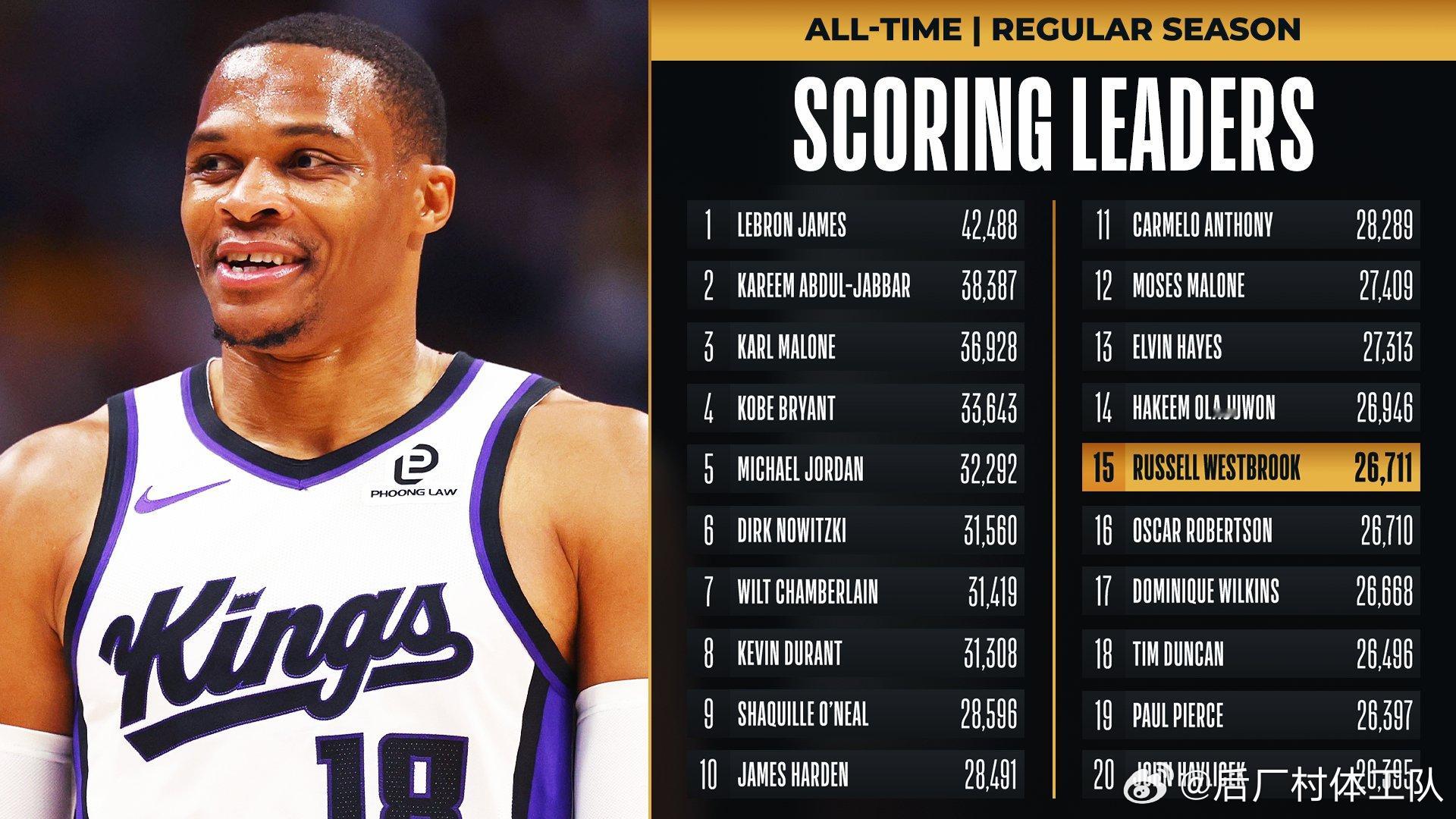 威少加冕NBA历史控卫得分王 国王惨败太阳,威少全场拿到17分9篮板6助攻,在NBA历史得分榜上超越奥斯卡-罗伯特森,排名第15位。也因为此,威少成为NBA历史控卫得分王。 目前NBA历史得分榜前十四位的是:詹姆斯、贾巴尔、卡尔-马龙、科比、乔丹、诺维茨基、张伯伦、杜兰特、奥尼尔、哈登、安东尼、摩西-马龙、埃尔文-海耶斯、奥拉朱旺。这当中,自然是将哈登分在了分卫位置。