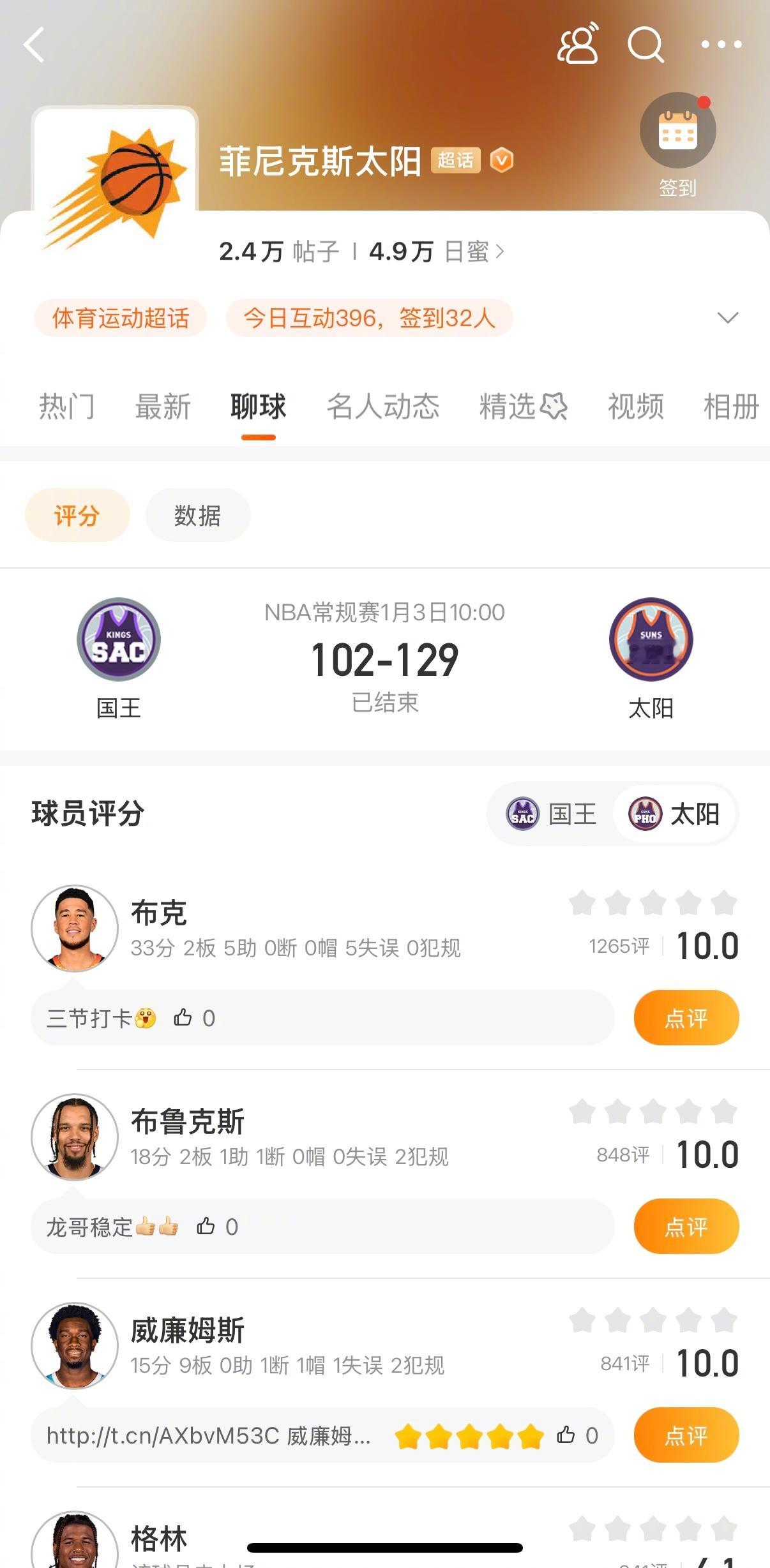 威少加冕NBA历史控卫得分王 太阳129-102战胜国王!太阳方面,布克31分2篮板5助攻;布鲁克斯18分2篮板1助攻;威廉姆斯15分9篮板。国王方面,默里23分9篮板2助攻;德罗赞13分2篮板3助攻;威斯布鲁克17分9篮板6助攻,生涯常规赛总得分达到26711分,同时成为NBA历史上得分最多的控球后卫!快来 网页链接和 网页链接为你喜爱的球员打分吧~