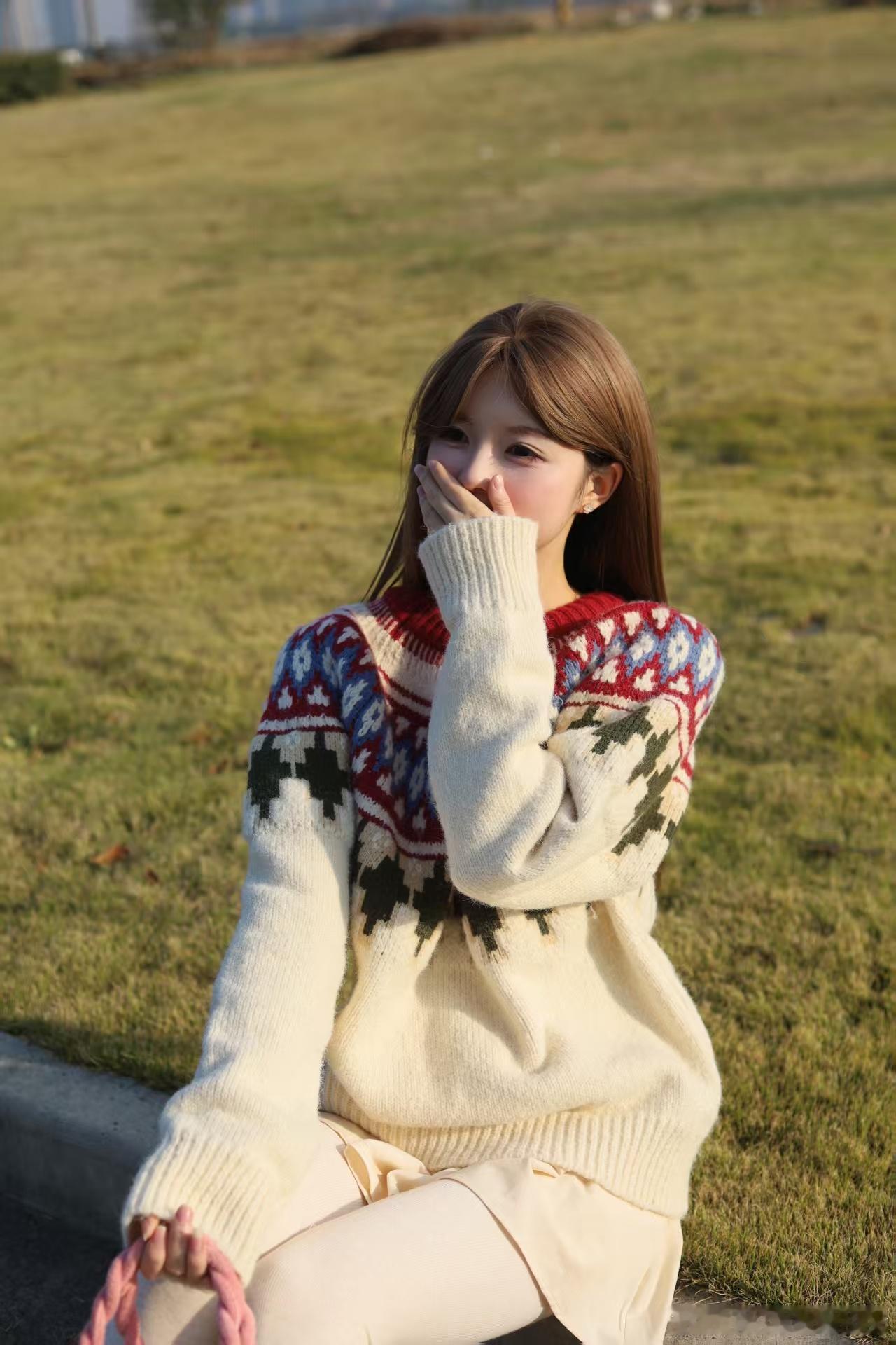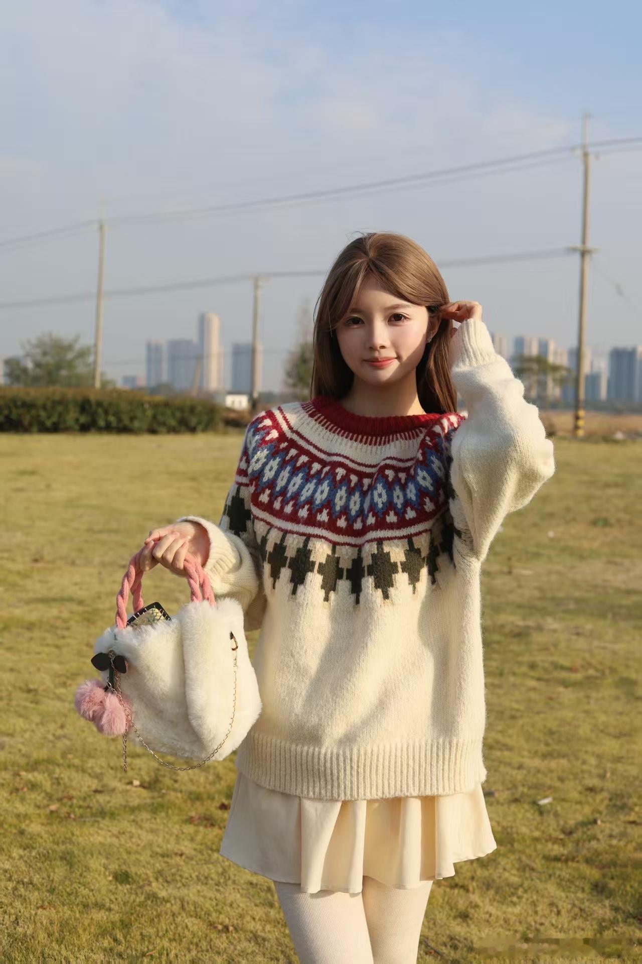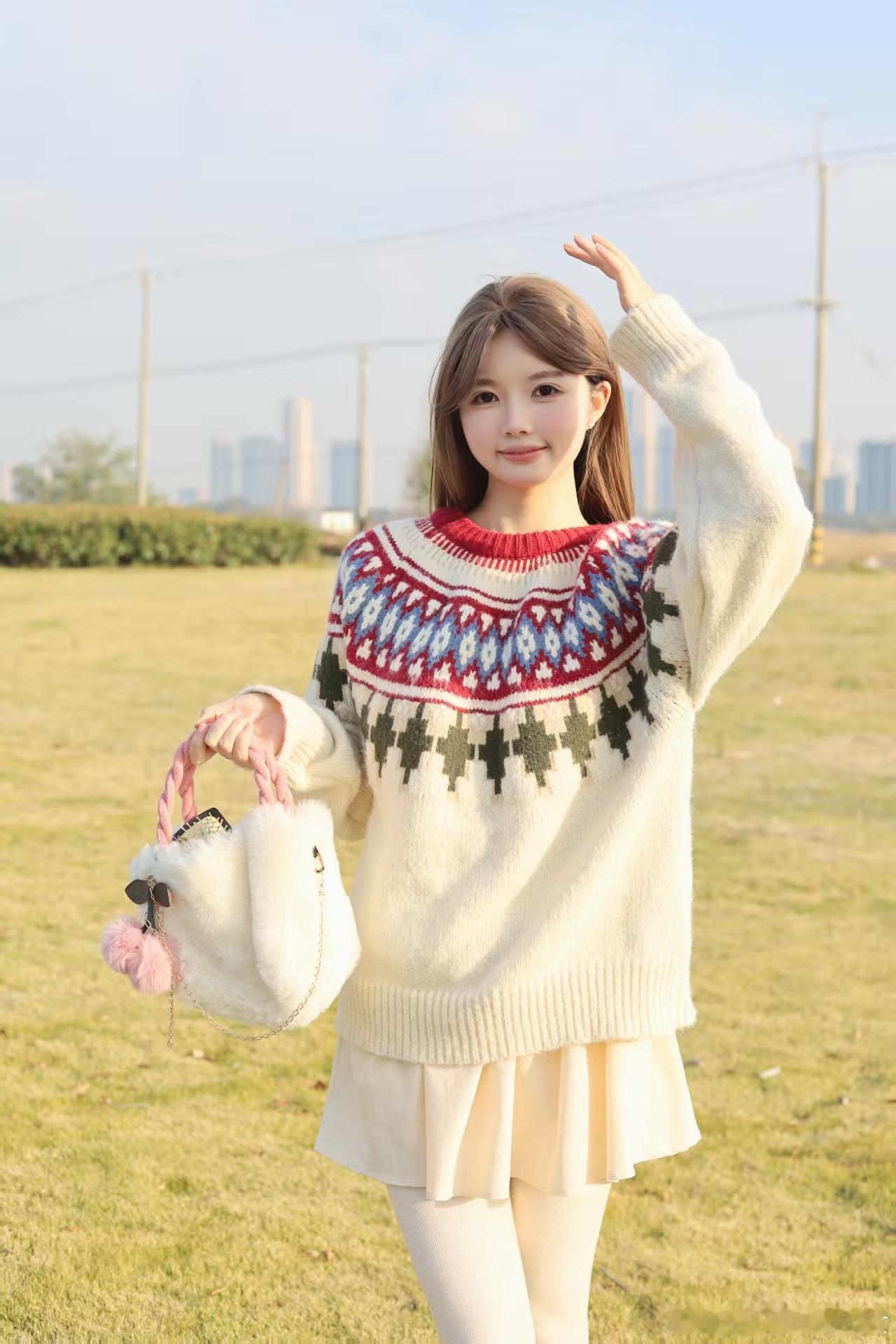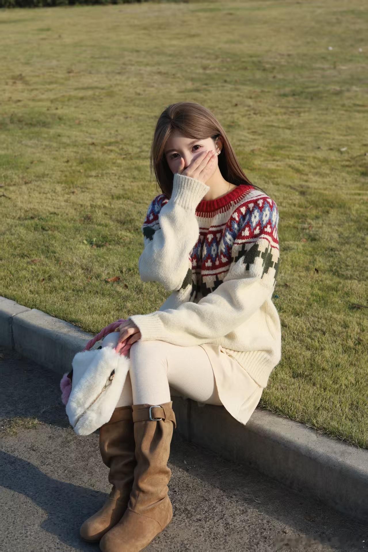 今日分享啦啦!奶呼呼提花毛衣+米白裙+长靴,一套暖到心巴!阳光正好,坐在草地上比耶、捂嘴笑,氛围感拿捏~手拎毛绒小包,风里都是温柔的味道~