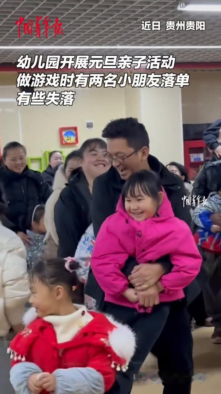 幼儿园开展元旦亲子活动,做游戏时有两名小朋友落单,有些失落。 中国青年报。 近日贵州贵阳,一名家长和一名老师见状赶紧抱起了落单的小朋友。 家长杨女士:红色衣服的小女孩她妈妈来了,但是她妈妈脚受伤了。小男孩是因为来的是他爷爷,爷爷可能年纪比较大了,不太懂这些游戏规则。后来这个小男孩也一直就全程跟着我老公,挺开心的。