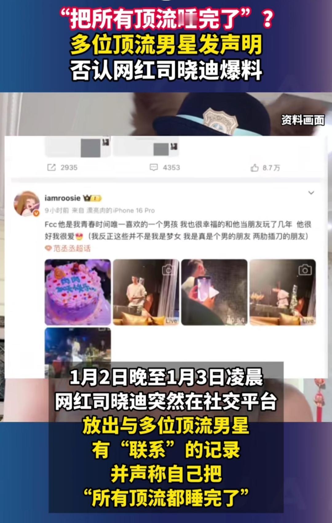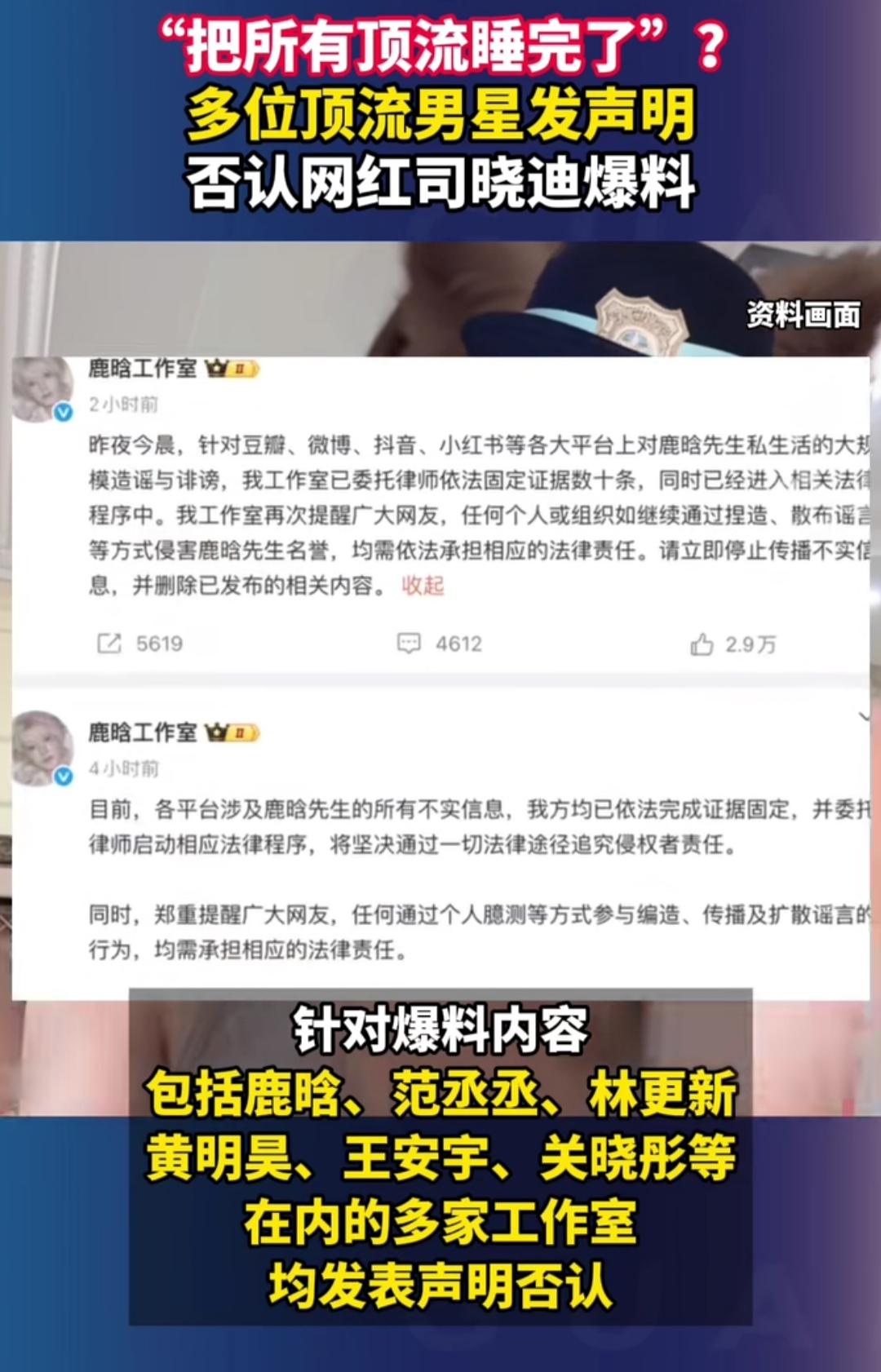 刷到司晓迪的动态时,我还抱着吃瓜的心态点进去——毕竟“网红爆料顶流”的戏码,总能勾着人的好奇心。可看到她那句“把所有顶流都睡完了”,再配上几张没头没尾的截图,瞬间觉得这瓜不仅不甜,还透着一股子刻意的油腻。 她口中的“顶流”名单长到离谱,范丞丞、鹿晗、林更新全被拉进来,甚至关晓彤也躺枪。可闹剧没演多久,各家工作室就接连发声明打脸:有的说只是点头之交,有的直接指认她无证据造谣,黄明昊团队更是放话要追究法律责任。 说到底,这哪里是爆料,分明是把造谣当博眼球的捷径。流量时代里,总有人觉得靠一句狂言、几张假截图就能收割关注,却忘了网络不是法外之地。消费艺人声誉换来得关注,终究是镜花水月,最后只会落得个被网友唾弃的下场。