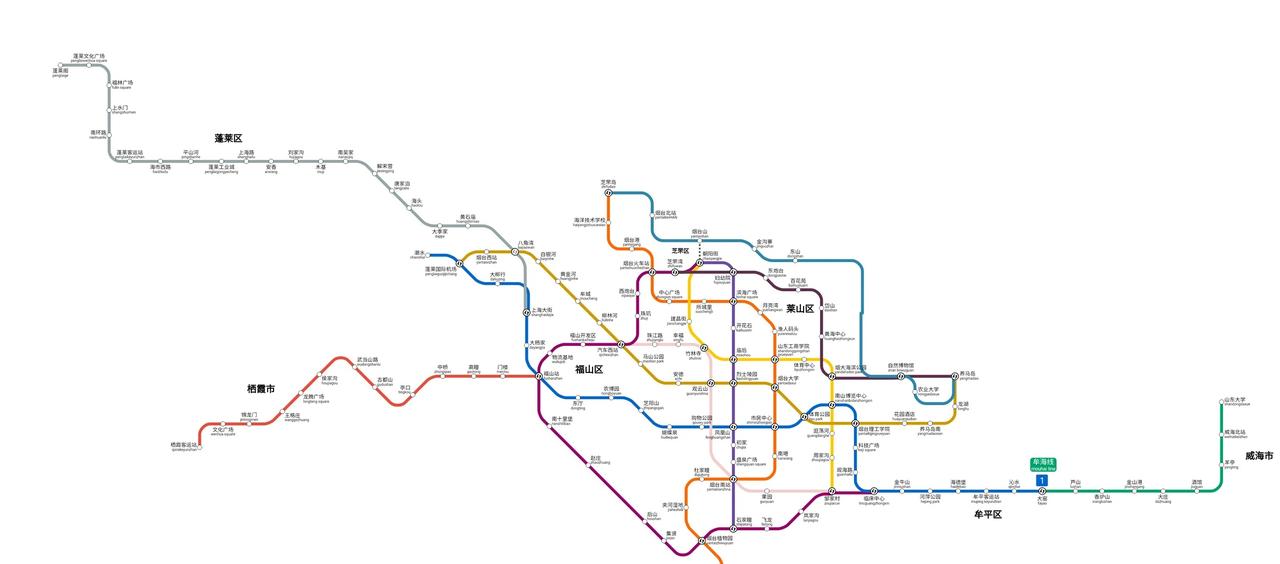 烟台地铁线路图(自制) 1号线:大窑~潮水 2号线:芝罘岛~回里 3号线:养马岛~蓬莱国际机场 4号线:临床中心~朝阳街 5号线:邹家村~朝阳街 6号线:朝阳街~石家瞳 7号线:养马岛~芝罘湾 8号线:汽车西站~邹家村 9号线:芝罘岛~养马岛 10号线:上海大街~蓬莱阁 11号线:福山站~栖霞客运站