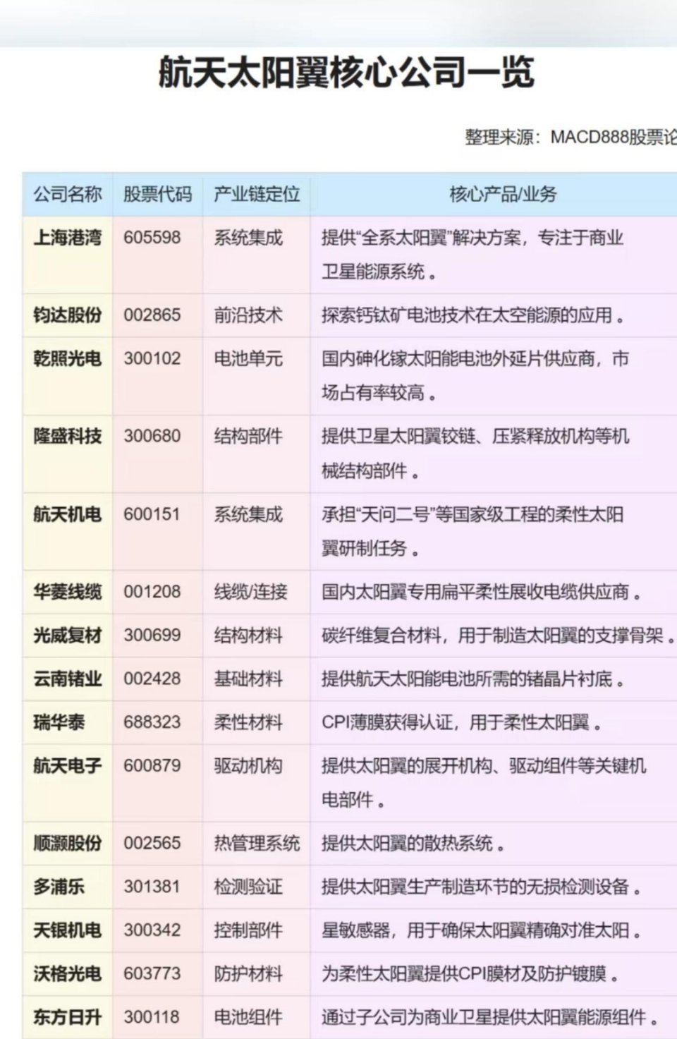 商业航天:太阳翼概念!商业航天火箭发射爆炒,相关航天材料,航天备件,上游材料获得资金关注相关太阳翼概念:1.系统集成,能源系统2.结构部件3.线缆连接4.驱动系统,柔性材料5.星敏感器,控制材料