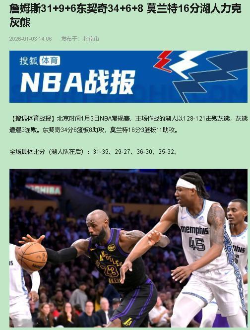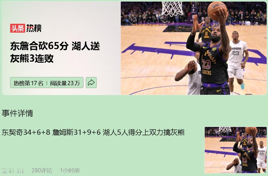别看湖人赢了,但我得说,这场胜利真有点“毒奶”的味道。赢得心惊肉跳,反而把老毛病全暴露了——这就是典型的“球星兜底,阵容挖坑”。东詹合砍65分 湖人送灰熊3连败 开头气势如虹拉开分差?假象!灰熊一醒,唰一个16-4追平。第二节更离谱,领先15分能被对手轰个18-0,整整5分钟不得分!这哪像争冠队?全靠41岁的老詹连拿6分止血。说白了,阵容深度是硬伤,离了詹东双核,队伍随时崩盘。 下半场就是巨星互飙,战术?基本没有。防守让缺兵少将的灰熊拿了121分,自家首发中锋艾顿就4分6板,存在感稀薄。赢球全靠东契奇、詹姆斯关键时刻硬解,加上对手最后失误。赢是赢了,但过程看得人心慌。 说真的,这种“啃老”(詹姆斯)加“啃小”(东契奇)的模式,能走多远?你不能指望他俩场场超神。角色球员必须站出来,把“双核驱动”变成“全队飙车”,防守和稳定性才是生命线。 这场球给湖人敲了警钟:巨星闪光能赢一场,但想走得更远,还得靠团队扎紧篱笆。球迷们既为老詹破纪录开心,也更期待他们能真正补上短板。詹姆斯31+9+6东契奇34+6+8 莫兰特16分湖人力克灰熊