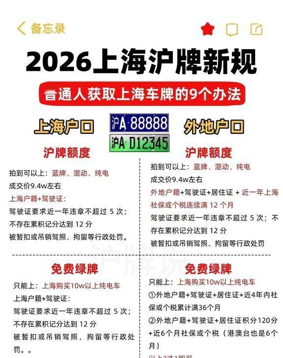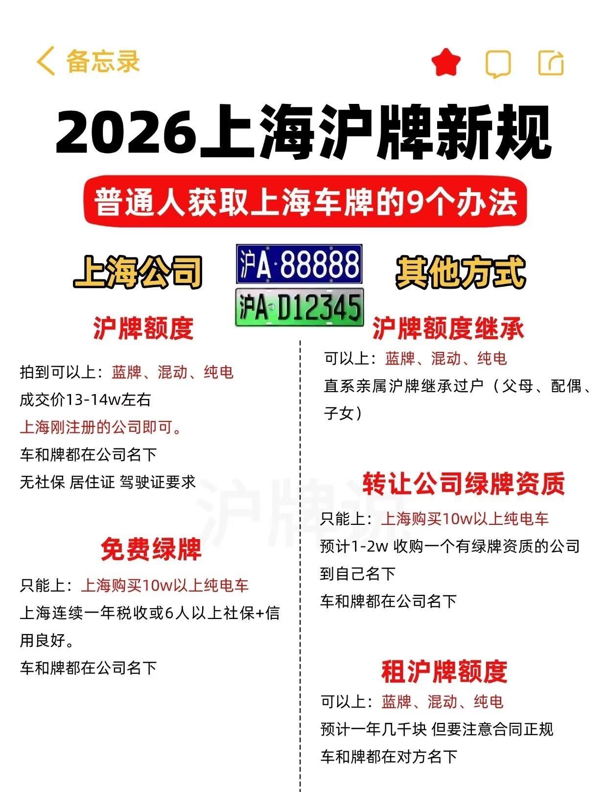 2026上海沪牌新规,普通人获取沪牌的9个方法 2026 年想拿到上海沪牌,这 9 种方法一定要知道,不同情况都有合适途径,快收藏👇 🔥上海户籍(2 种) 1️⃣沪牌额度:9.4w 左右,蓝 / 混动 / 纯电通用,需上海户籍 + 驾驶证; 2️⃣免费绿牌:买 10w + 纯电车,条件同沪牌额度。 🔥外地户籍(2 种) 1️⃣沪牌额度:9.4w 左右,需外地户籍 + 驾驶证 + 居住证 + 近 1 年社保 / 个税; 2️⃣免费绿牌:买 10w + 纯电车,二选一:①近 4 年社保 / 个税累计 36 个月;②居住证积分 120 分 + 近 6 个月社保 / 个税。 🔥上海公司(2 种) 1️⃣沪牌额度:13-14w 左右,刚注册公司就能申,蓝 / 混动 / 纯电通用; 2️⃣免费绿牌:买 10w + 纯电车,需公司连续 1 年纳税 / 6 人以上社保 + 信用良好。 其他方式(3 种) 1️⃣继承:直系亲属过户沪牌额度; 2️⃣转公司绿牌:1-2w 收购带绿牌资质的公司; 3️⃣租额度:年付几千,合同要正规。 —————— 上海沪牌注意事项⚠️ 沪牌额度可退(按次月成交价); 免费绿牌跟车不跟人,换车重审; 租牌 / 收公司绿牌盯好合同; 有额度不能再申绿牌。 — 我是小东拍沪牌10年的技术员🧑💻大家有沪牌问题随时滴滴 沪牌 拍沪牌攻略 拍沪牌 沪牌拍牌 上海拍沪牌 沪牌说小东 靠谱拍沪牌 拍沪牌条件拍上海沪牌