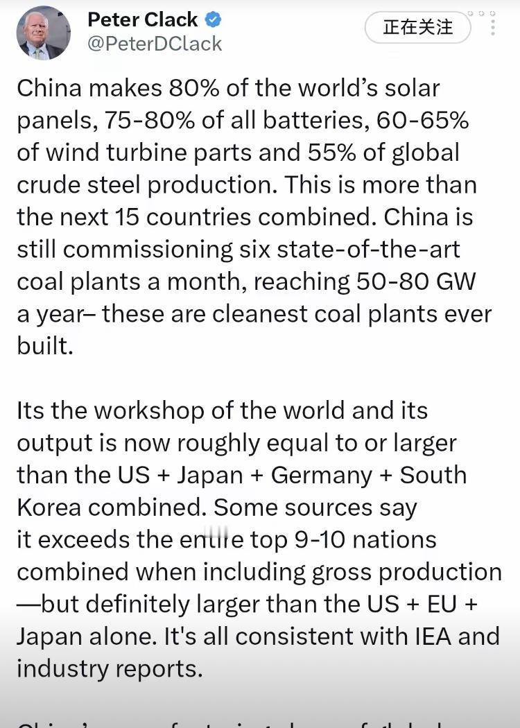 每月6座清洁煤电+80%光伏产能 中国的能源布局藏着什么智慧? 澳大利亚科学家皮特·克拉克的新年(2026年1月1日)发文炸翻全网:中国包揽全球80%太阳能电池板、75-80%电池产量,60-65%风电部件和55%粗钢产能,单项都超紧随其后15国总和,更让人意外的是每月仍投产6座最先进燃煤电厂。这组反差数据,让全球看懂中国能源战略的深层逻辑。 这些硬核产能绝非偶然。我国连续15年稳居全球制造业第一大国,220多种工业产品产量全球第一,完整的产业链让新能源装备实现规模化降本。截至2024年,可再生能源总装机达21.6亿千瓦,占全球40%以上,“新三样”出口超万亿元,光伏产品连续4年出口破2000亿元,用实力降低全球绿色转型成本。 而清洁煤电的布局更显智慧。我国“富煤、贫油、少气”的资源禀赋,决定了煤电仍是能源保供“压舱石”,其提供的70%顶峰能力和80%调节能力,是风电、光伏等新能源稳定并网的关键。这些新建电厂绝非旧产能,而是达到“近零排放”标准,烟尘、二氧化硫排放量远低于燃气电厂,94%的煤电机组已完成超低排放改造。 这种“新能源领跑+清洁煤电兜底”的模式,正在改写全球能源格局。过去十年全球光伏度电成本下降80%,中国的技术迭代和规模效应功不可没,让发展中国家得以低成本拥抱清洁能源。中国不是在“选边站”,而是用实际行动探索一条兼顾发展与环保的可行路径。 说几句:克拉克的观察戳中了核心:中国的产能优势本质是发展战略的胜利。既不盲目弃煤,也不放缓新能源步伐,这种立足国情的务实选择,既保障了自身能源安全,也为全球能源转型提供了“中国方案”。未来,随着煤电“三改联动”深化和新能源技术升级,这种“双轮驱动”的模式,必将为应对全球气候变化贡献更大力量。