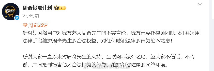 周奇工作室回应司晓迪爆料周奇方回应司晓迪爆料 “针对某网络用户对我方艺人周奇先生的不实言论,我方已委托律师团队取证并采用法律手段维护周奇先生的合法权益,对任何触犯法律的行为绝不姑息!”
