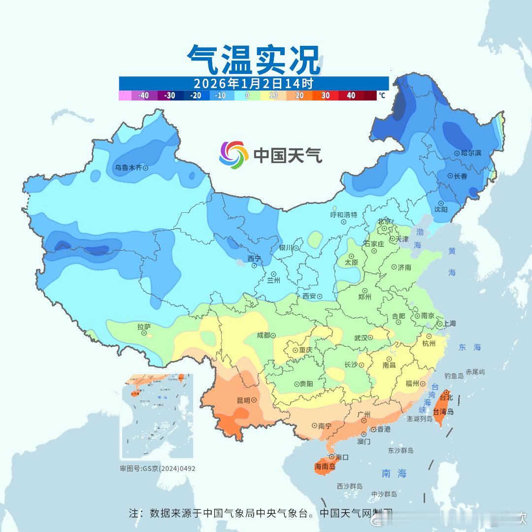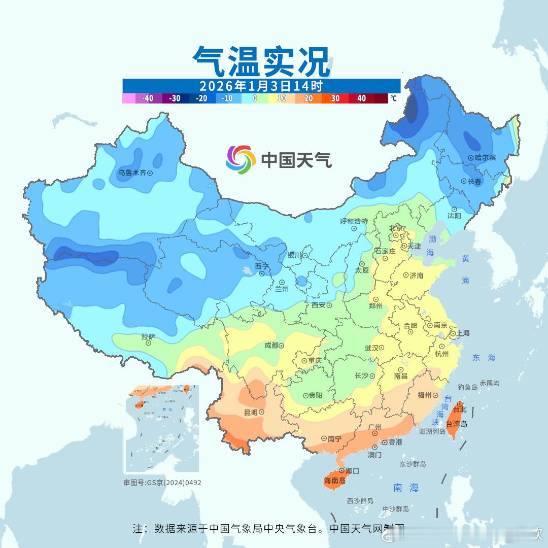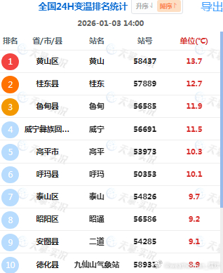 【升温】今天东部地区气温普遍回升,安徽黄山升13.7℃,成为14时全国升温最强站点。对比昨天14时和今天14时,5℃线从江西北部、安徽南部、浙江北部北扩了大约1000公里,抵达北京北部-河北东北部。