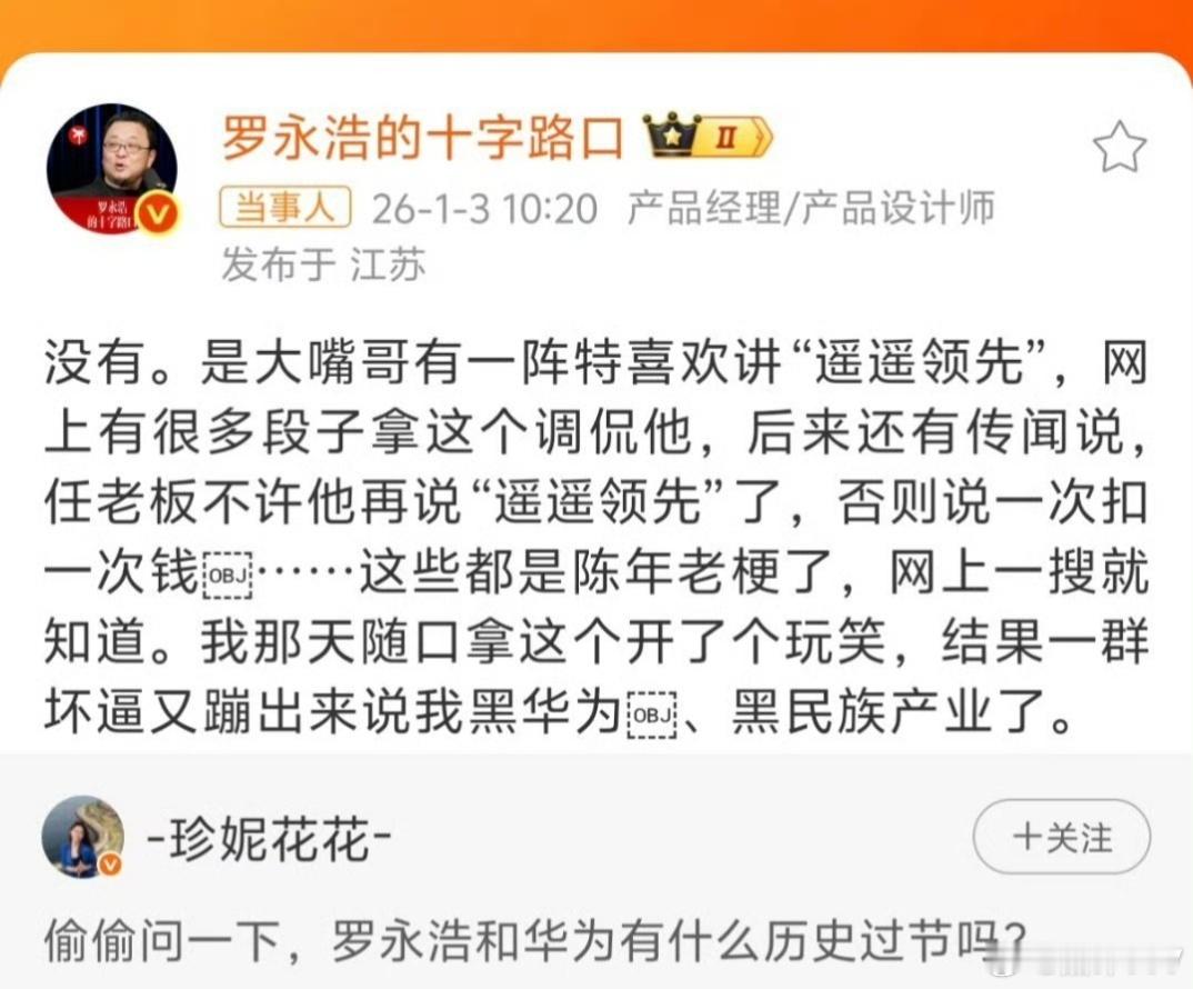 太君和华为没有过节,然后当着现场几千人和线上千万人的面直接侮辱和调侃华为,事情过后一句“玩笑话”就想草草了事,把余承东当作搞流量的玩具,把华为当作搞流量的笑话,把自己的快乐建立在千千万万华为真爱粉的痛苦之上,这绝对是不能原谅的!!太君的嘴,骗人的鬼,不可能永远只有他骂别人,早晚有一天,他必须为他的无知和臭嘴付出代价,我相信会有那么一天的!罗永浩说和华为没有过节