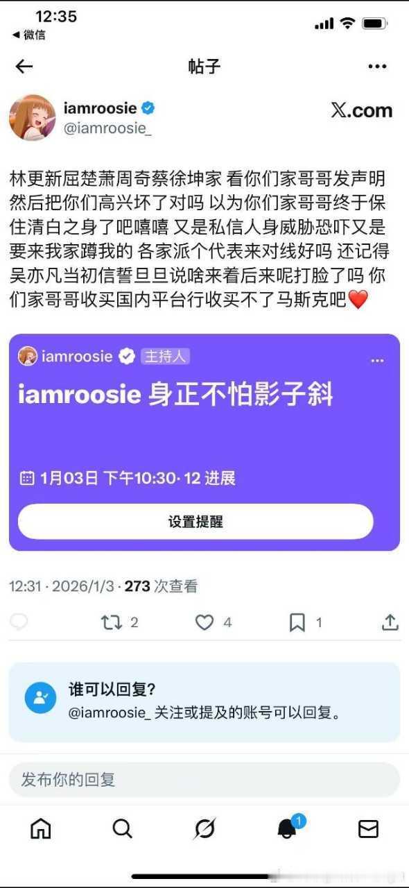 iamroosieiamroosie司晓迪怎么都转战X了,说是明星让平台出手了,还点名林更新、屈楚萧、周奇、蔡徐坤,事情还没完?