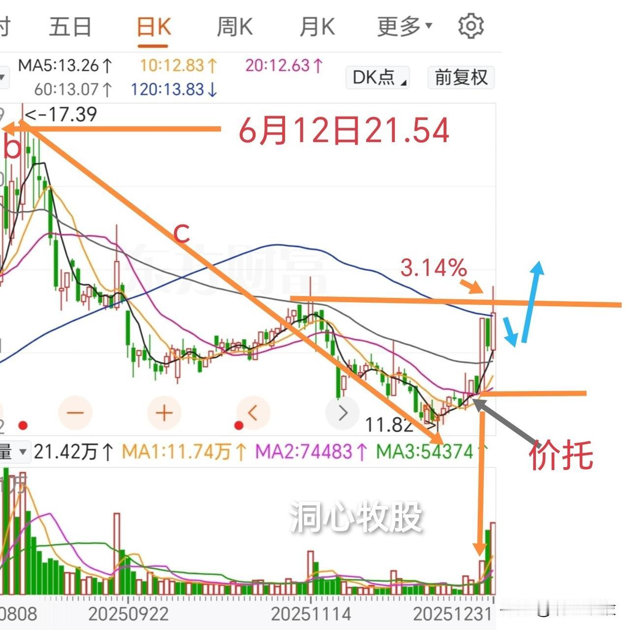 下午抽点时间,再来练练盘感。 下面这只票,价格也是腰斩的,只不过比早上那只下跌时间更长。 这只票6月12日见顶,后开始慢慢下跌之路,大家看到的是下跌c段,12月17日见底,基本跌了小半年,价格腰斩。 触底反弹不久,5日均线与10日均线金叉,接着10日均线与20日均线也金叉,形成了标准的“价托”区间,意味着后续上涨的可能性大。 价托刚形成,12月29日就突然涨停,放3倍量;30日放倍量下跌调整洗盘,可见抛压很重;主力比较心急,次日没有继续洗盘,31日放量上攻,接近涨停,无奈抛压还是很重,冲高回落,回落幅度3.14%,有点诱多嫌疑。 回落幅度按参考值3.00%看,较大,按常规节后开盘洗盘的可能性大,但据主力的脾气看,也可能直接暴力向上的可能。涨跌难料! 你有什么意见评论区留言交流,但不要提名称,要遵守平台规则,谢谢! 市场多变,涨跌难料。谨慎操作,不对就跑。 投资有风险,入市需谨慎。仅个人观点,不构成投资建议!
