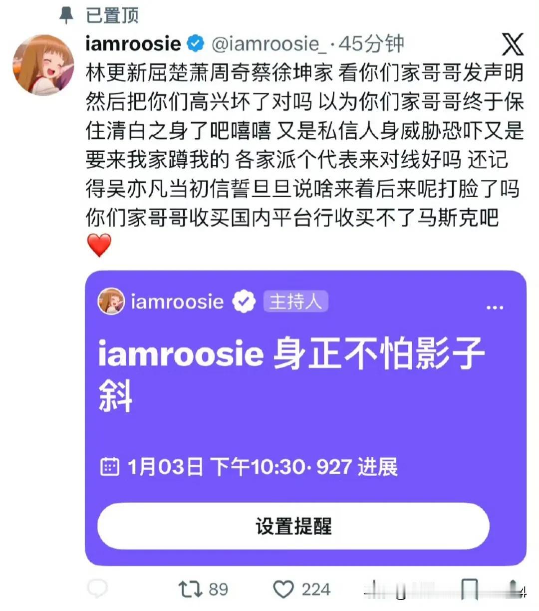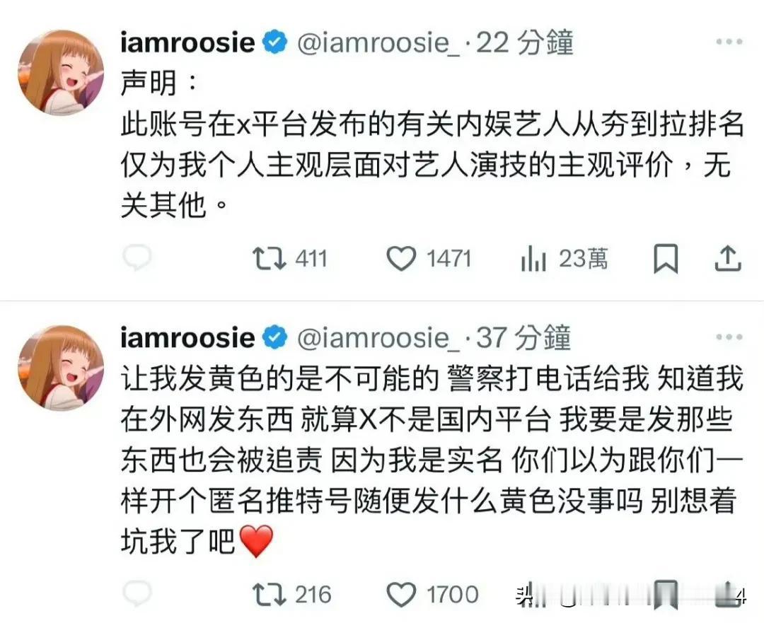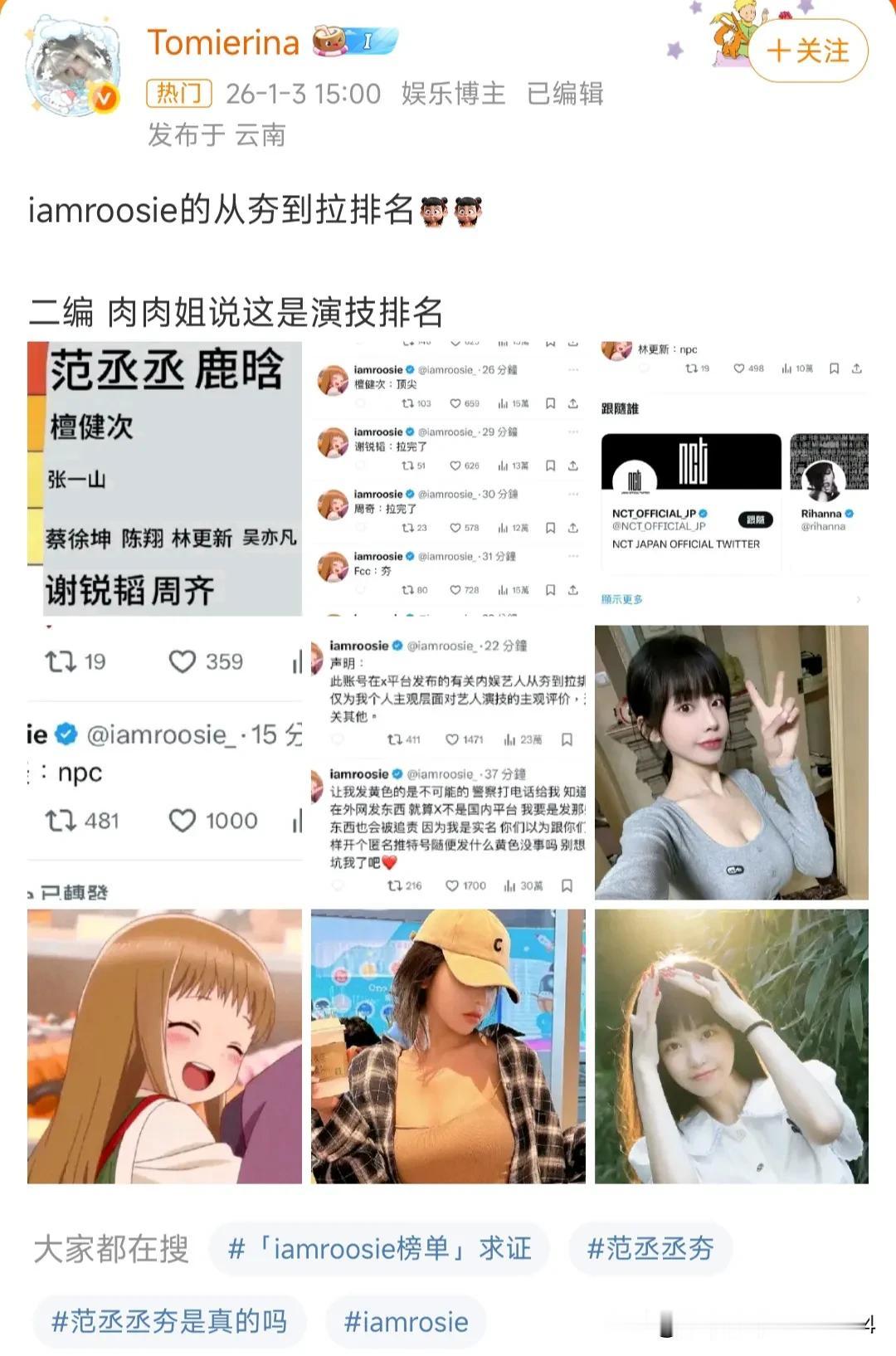 更猛的要来了!开年就引起娱乐圈超级地震的司晓迪,清空了除林更新以外所有顶流男星的爆料博文。随后,司晓迪再次微博发文“新的一年,我要好好爱自己。” 但她却是转战外网X,还给男顶流们来了一期从夯到拉的排名: 鹿晗夯、fcc夯、檀健次顶尖、张一山人上人、林更新npc、陈翔npc、周奇拉完了、谢锐韬拉完了。 之前她微博发的私密照片可以看出,此女确实跟男星们有点交情。但从聊天记录看,关系又挺正常的。 当时司晓迪反驳说有很多没发的实锤证据,有点涉黄,容易封号。现转战外网的司晓迪暗示称,她很快会把这些敏感内容发出来。 但紧接着她又发文称,蜀黍已经给她打电话了,为了不被坑,有些东西她还是不发了! 反反复复,真真假假,她难道不怕被男明星们集体诉上法庭,赔得裤子都不剩吗[what] 如何看待檀健次委托律师进行证据固定