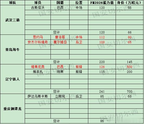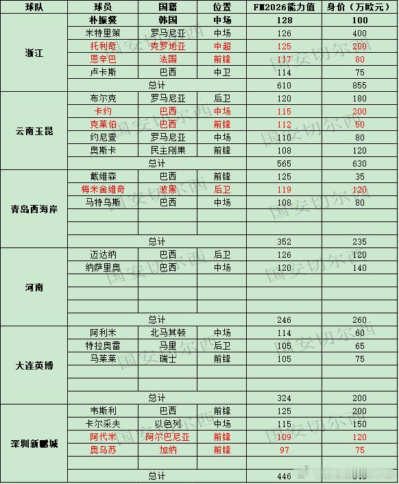 【中超外援】 2026中国冬季国际转会窗已经开启,继续开始更新中超各队的外援情况,随着窗口打开,各队都会官宣外援,也会随时更新。表中如有错误会及时更正,标红为球队有意外援没有官宣或还不确定是否留队者。 黑色加粗者为确定并官宣新外援。 FM数据为最新版本FM2026最新能力值。