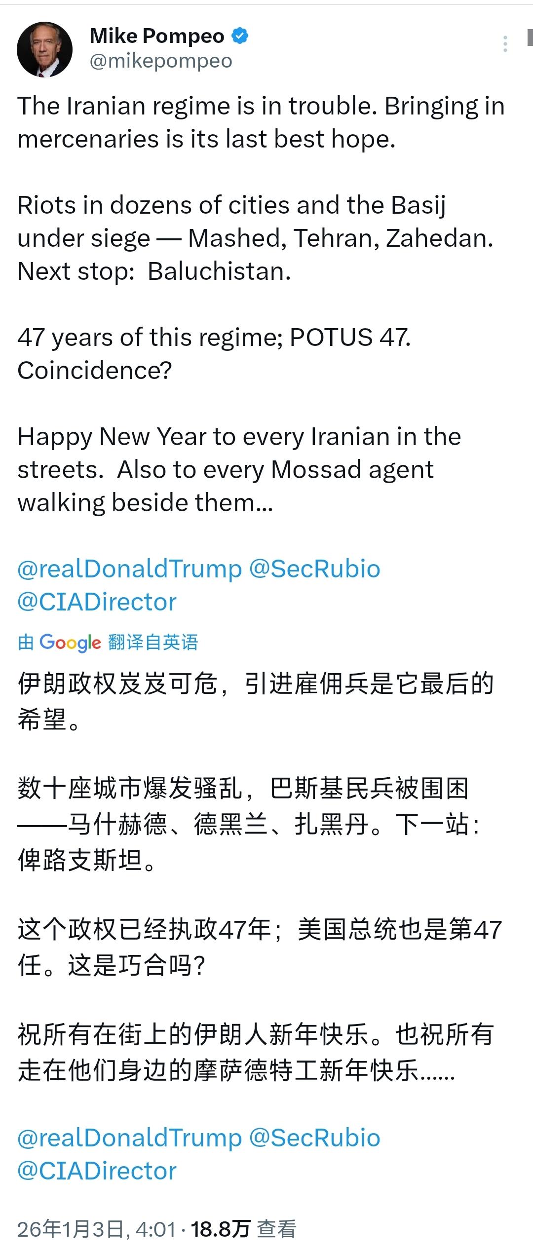一向仇视伊朗的美国前国务卿蓬佩奥今天(北京时间1月3日)发文写道:伊朗政权岌岌可危,引进雇佣兵是它最后的希望…… 蓬佩奥这番话,看似玩笑,实则藏着深意。他用两个“47”做出对比:伊朗政权已存在47年,而美国现在的总统,正好是第47任。 这是简单数字游戏?显然不是。对精通政治暗语的老牌鹰派来说,这更像一种宣告式象征。在他们眼中,伊朗这个政权已经走到尽头,美国正在迎来一个“历史交替”的窗口期。 而这种暗示,并非凭空而来。蓬佩奥提到“数十座城市骚乱”“巴斯基民兵被围困”,这些都不是空穴来风。 确实,过去几周,伊朗内部局势出现明显不稳。德黑兰、马什赫德、扎黑丹接连传出抗议升级、警民冲突加剧的消息。特别是扎黑丹,地处俾路支族人聚居区,宗教与政治长期矛盾重重,是伊朗最难掌控的火药桶之一。 当街头火焰四起、内部动荡加剧,政权合法性本身也在被消耗。这个时候,一个长期敌视伊朗的美国前国务卿跳出来放话,说是“政权末日”临近,也就不再只是嘴皮子功夫了。 蓬佩奥提到,“巴斯基民兵被围困”这句话,不是随口加戏,而是点中了伊朗政权的命门。 巴斯基(Basij)民兵,是伊朗革命卫队的延伸,是政权的忠实武装力量。这支部队向来以压制抗议、不惧冲突著称。它不是正规军,却几乎渗透到伊朗社会每个角落。 可现在,蓬佩奥直接点名:他们在马什赫德、德黑兰、扎黑丹被围困。这是在告诉外界:连最听话、最强硬的镇压机器,也挡不住这波浪潮。 而抗议的导火索,早已不止是经济。通胀、物价、失业只是表面,更深的,是制度困局与族群裂缝的交叉爆发。俾路支斯坦、库尔德、阿拉伯裔地区本身就对中央政府长期不满,一旦有火星,很快能烧成大片。 据伊朗反对派流亡组织和外媒数据,12月下旬至今,已有至少30多个城市出现抗议、示威,并伴随警察、情报机构的武力介入。而部分城市中,确实出现安全人员“无法立刻恢复秩序”的局面。 这也是为什么,蓬佩奥才会在文中用“俾路支斯坦是下一站”来强调——这不是结束,而是升级前夜。 “也祝所有走在他们身边的摩萨德特工新年快乐。” 这是什么意味?在国际政治中,这相当于公开点名以色列情报机关正插手伊朗国内局势。而对于熟悉中东局势的人来说,这几乎不是假设。 从历史上看,摩萨德早在本世纪初就在伊朗境内进行多起“定点清除”行动,包括暗杀核科学家、发动网络战“震网”病毒、策反内部线人。而当伊朗国内陷入混乱,摩萨德是否会趁势而入,根本不需要用“是否”来问,只有“已经在哪儿”来追。 所以蓬佩奥这句话,不只是调侃,而是一种放话式的提醒: “我们的人,已经在你们中间。” 这对伊朗政权而言,是公开羞辱,更是战略压力。 伊朗不会因为战争被打垮,但可能因为内部失控而自己垮台。 从2022年的马赫萨·阿米尼事件引发的女性抗议,到现在的多地联动示威,伊朗社会矛盾早已不是单点爆发。 宗教与自由的撕裂,种族与中央的割裂,经济与腐败的缠绕,全都在这个47年政权体内同时病变。 而美国,不管是拜登政府的“谨慎围堵”,还是蓬佩奥的“极限施压”遗产,背后目标一致——等这个政权自己崩。 只是现在,局势似乎真的走到一个临界点。 蓬佩奥选在新年第一天发声,不是偶然。他在告诉华盛顿,也在告诉世界:机会可能到了。 是否真的到了?没人能断言。 但从马什赫德到俾路支斯坦,街头的火光已经开始蔓延。 权威信源: Reuters(路透社):《伊朗多城示威持续,美国前国务卿蓬佩奥称伊朗政权“岌岌可危”》