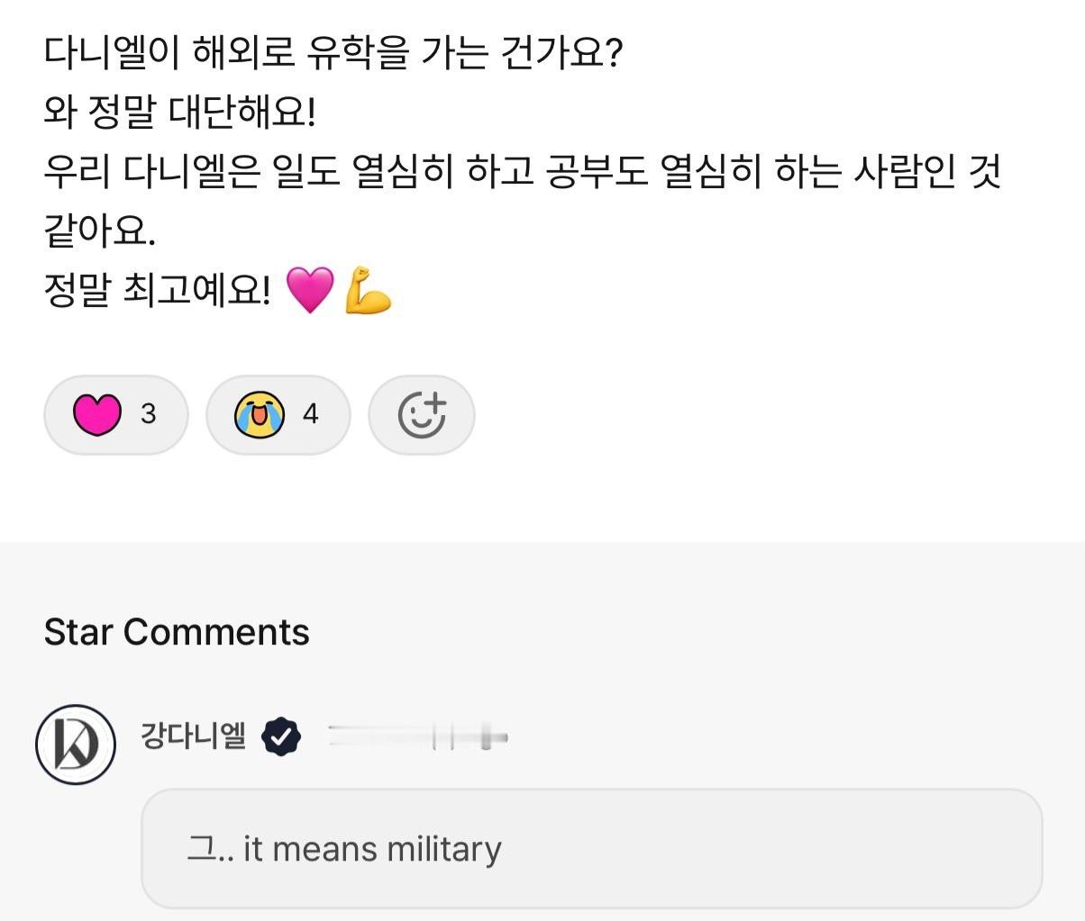 WANNA·ONE活动只能参加一部分的姜丹尼尔- 粉丝:我们的尼尔,WANNA·ONE参加吗- 姜丹尼尔:啊 很多人给我提问过了...那不是真人秀吗?我因为明年要去留学吗,所以只参加intro程度吧* 留学是指服兵役