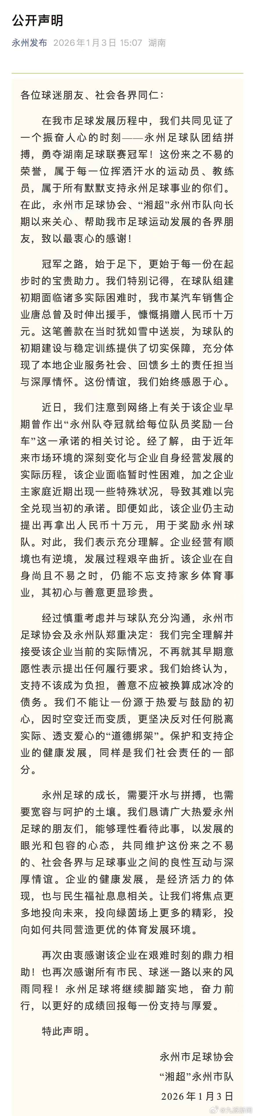 #官方通报老板承诺夺冠奖车未兑现#【#老板承诺奖车未兑现球队称理解接受#】1月3日,永州市足球协会“湘超”永州市队发布公开声明:在我市足球发展历程中,我们共同见证了一个振奋人心的时刻——永州足球队团结拼搏,勇夺湖南足球联赛冠军!这份来之不易的荣誉,属于每一位挥洒汗水的运动员、教练员,属于所有默默支持永州足球事业的你们。在此,永州市足球协会、“湘超”永州市队向长期以来关心、帮助我市足球运动发展的各界朋友,致以最衷心的感谢!冠军之路,始于足下,更始于每一份在起步时的宝贵助力。我们特别记得,在球队组建初期面临诸多实际困难时,我市某汽车销售企业唐总曾及时伸出援手,慷慨捐赠人民币十万元。这笔善款在当时犹如雪中送炭,为球队的初期建设与稳定训练提供了切实保障,充分体现了本地企业服务社会、回馈乡土的责任担当与深厚情怀。这份情谊,我们始终感恩于心。近日,我们注意到网络上有关于该企业早期曾作出“永州队夺冠就给每位队员奖励一台车”这一承诺的相关讨论。经了解,由于近年来市场环境的深刻变化与企业自身经营发展的实际历程,该企业面临暂时性困难,加之企业主家庭近期出现一些特殊状况,导致其难以完全兑现当初的承诺。即便如此,该企业仍主动提出再拿出人民币十万元,用于奖励永州球队。对此,我们表示充分理解。企业经营有顺境也有逆境,发展过程艰辛曲折。该企业在自身尚且不易之时,仍能不忘支持家乡体育事业,其初心与善意更显珍贵。经过慎重考虑并与球队充分沟通,永州市足球协会及永州队郑重决定:我们完全理解并接受该企业当前的实际情况,不再就其早期意愿性表示提出任何履行要求。我们始终认为,支持不该成为负担,善意不应被换算成冰冷的债务。我们不能让一份源于热爱与鼓励的初心,因时空变迁而变质,更坚决反对任何脱离实际、透支爱心的“道德绑架”。保护和支持企业的健康发展,同样是我们社会责任的一部分。永州足球的成长,需要汗水与拼搏,也需要宽容与呵护的土壤。我们恳请广大热爱永州足球的朋友们,能够理性看待此事,以发展的眼光和包容的心态,共同维护这份来之不易的、社会各界与足球事业之间的良性互动与深厚情谊。企业的健康发展,是经济活力的体现,也与民生福祉息息相关。让我们将焦点更多地投向未来,投向绿茵场上更多的精彩,投向如何共同营造更优的体育发展环境。再次由衷感谢该企业在艰难时刻的鼎力相助!也再次感谢所有市民、球迷一路以来的风雨同程!永州足球将继续脚踏实地,奋力前行,以更好的成绩回报每一份支持与厚爱。