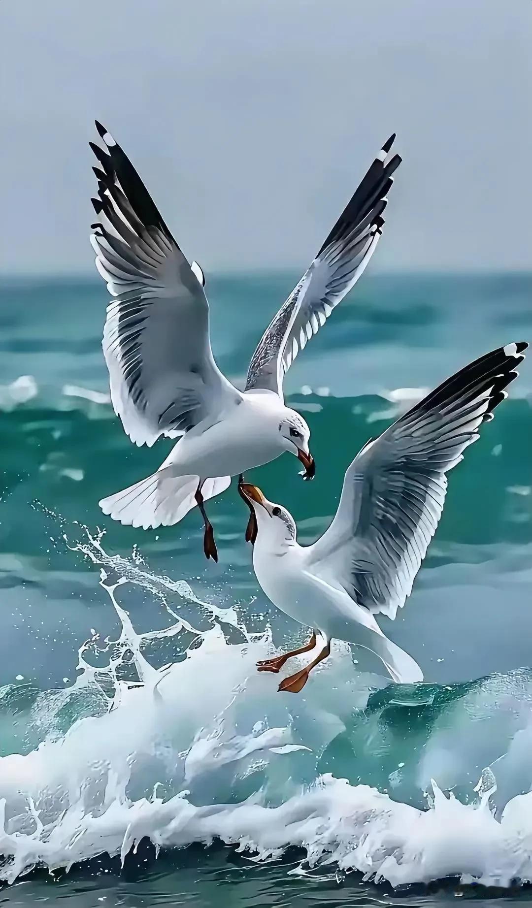 海鸥争食,海浪翻滚,自然之美尽收眼底!🌊🐦🐟