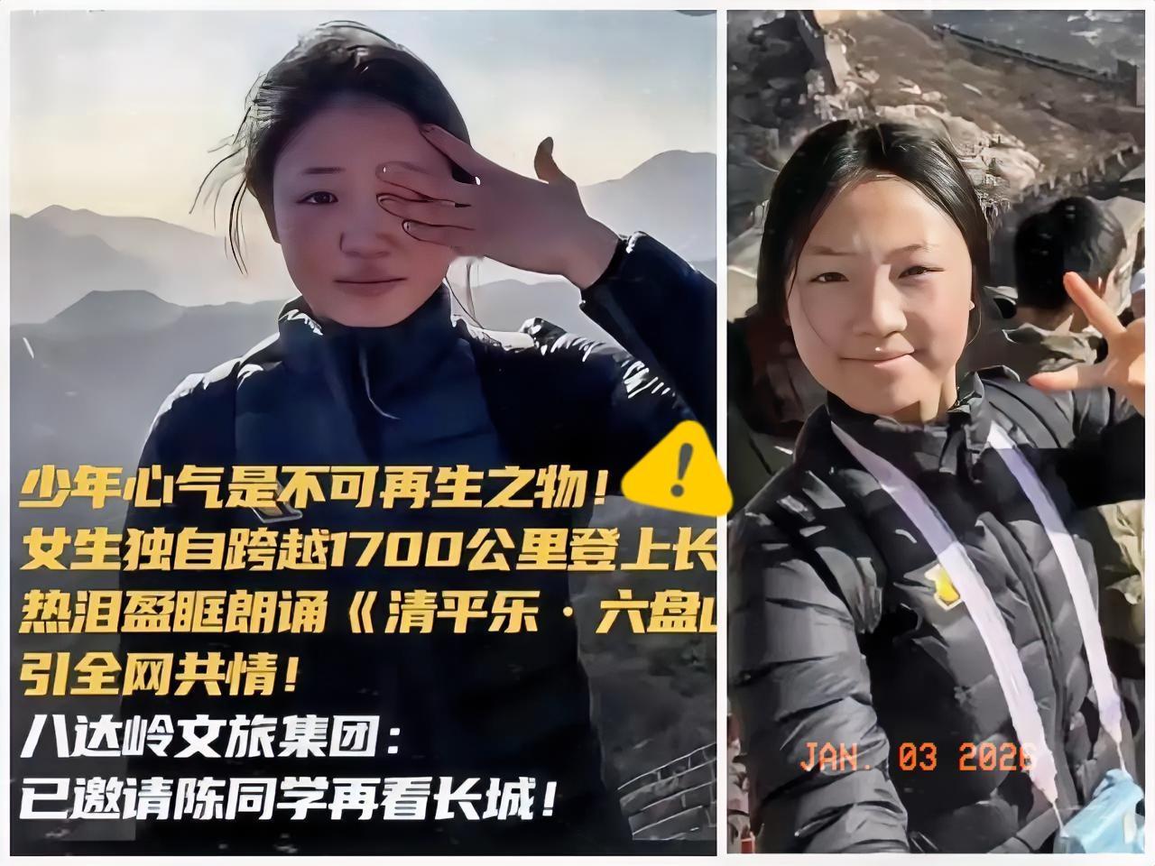 别再说家国情怀是空洞口号了!19岁女生陈欣妍的长城哽咽朗诵,才是最生动的答案。 这哪是什么“玄学面相”,分明是刻在骨子里的文化基因在发光。1700公里的奔赴,不是为了网红打卡,而是为了圆一场“不到长城非好汉”的初心之约。 站在长城之上,她被山河壮阔震撼到语塞,两次录制都忍不住哽咽,却在路人那句“屈指行程二万”的呼应中稳住心神。这份不掺演的真情,比任何精致表演都动人。 真正的家国情怀从不用刻意标榜,它是少年人面对民族脊梁时的热泪盈眶,是经典诗词在当下的鲜活延续。当Z世代用自己的方式与传统对话,文化传承才真正有了生命力。 你有没有过被某一瞬间的家国情怀打动?来评论区聊聊你的经历~