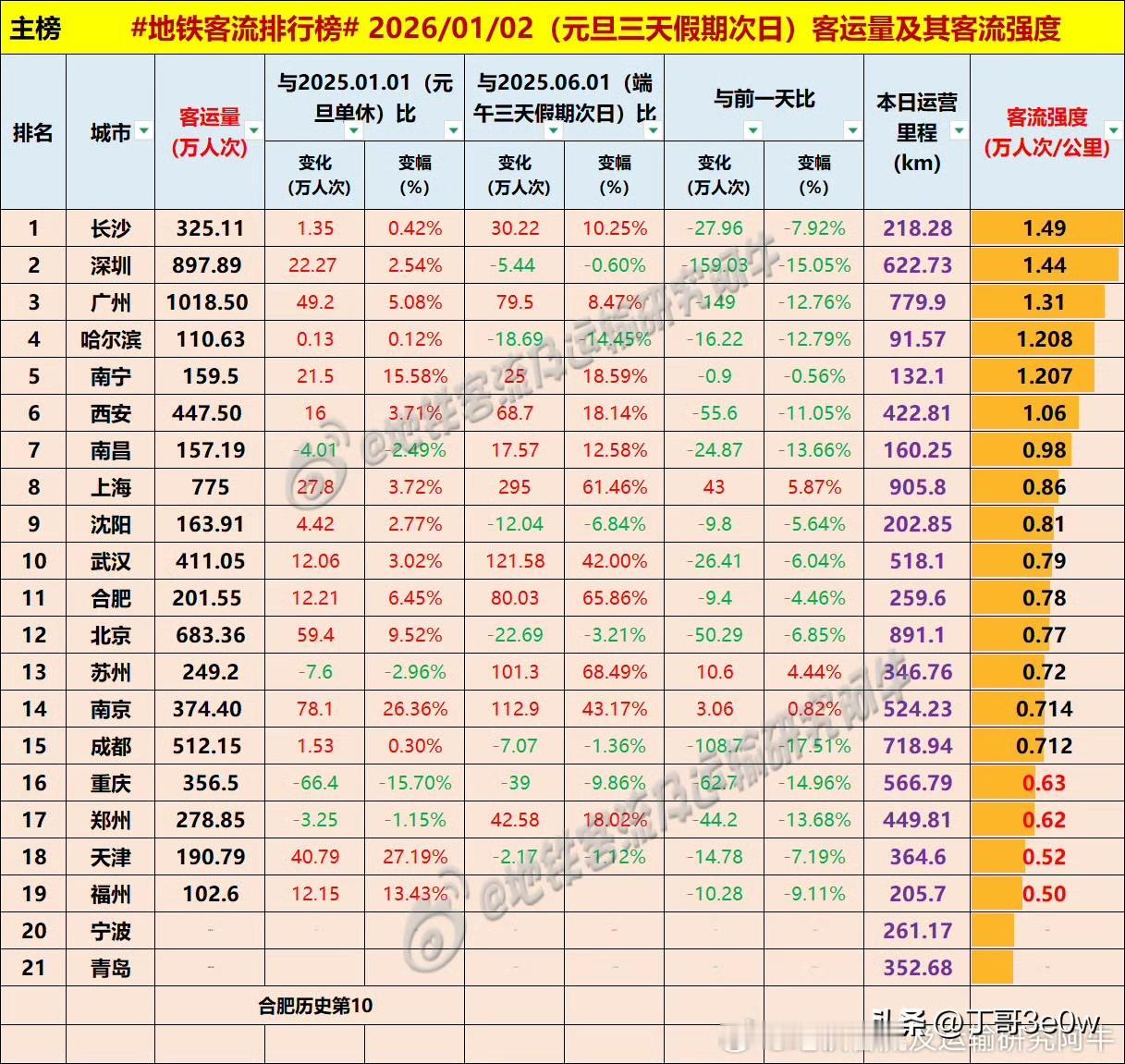 广州地铁客流量连续两天超千万人次,排名全国第一[呲牙][呲牙][呲牙] 爆料 身边事 中国地铁客流日报 昨日客流 广州地铁 周五 排行榜 2026年1月2日 星期⑤,休息日 全国重点城市轨道交通客流量排行榜: 广州:1018.50万广州地铁 深圳:897.89万深圳地铁 上海:775.00万 北京:683.36万 成都:512.15万 西安:447.50万西安身边事 武汉:411.05万武汉地铁 南京:374.40万南京爆料 重庆:356.50万重庆身边事 长沙:325.11万 郑州:278.85万郑州地铁 苏州:249.20万苏州地铁 合肥:201.55万 天津:190.79万天津身边事 沈阳:163.91万沈阳爆料 南宁:159.50万南宁地铁 南昌:157.19万 青岛:110万+青岛爆料 哈尔滨110.63万哈尔滨身边事 宁波:100万+宁波地铁 福州:102.60万