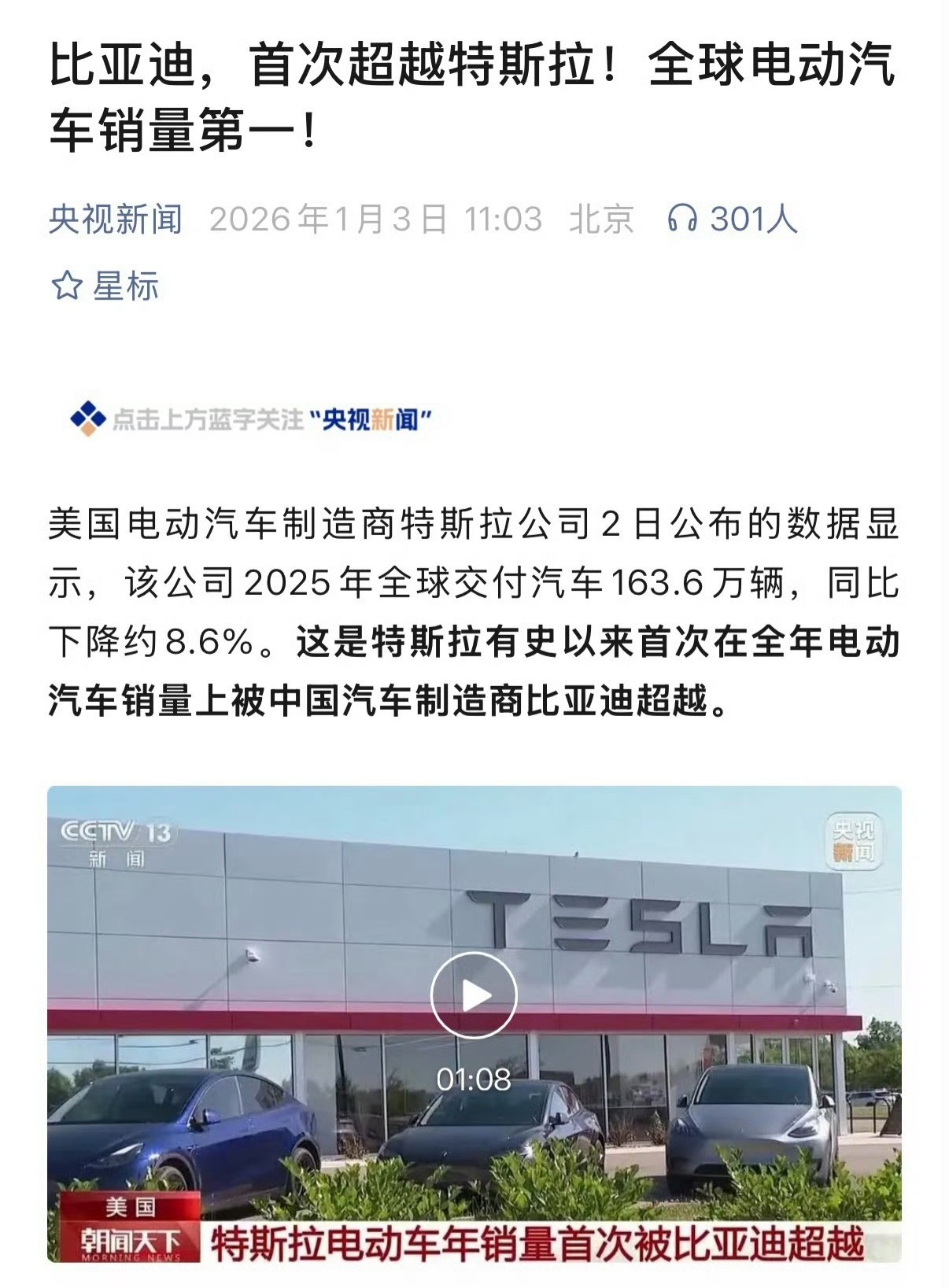 特斯拉2025年同比下滑了,比亚迪纯电车销量超过特斯拉,况且比亚迪还有混动车
