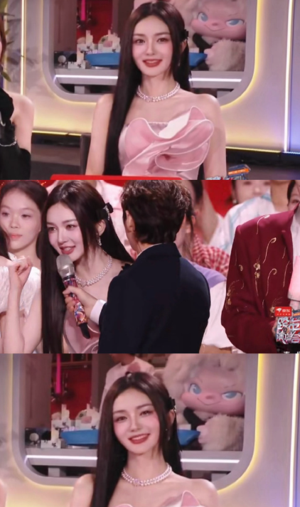 古力娜扎跳手势舞跳到一半,右肩带啪一声断了。亮片礼服往下滑,她右手一把拎住领口