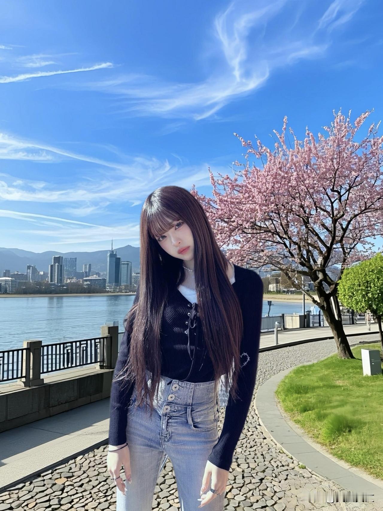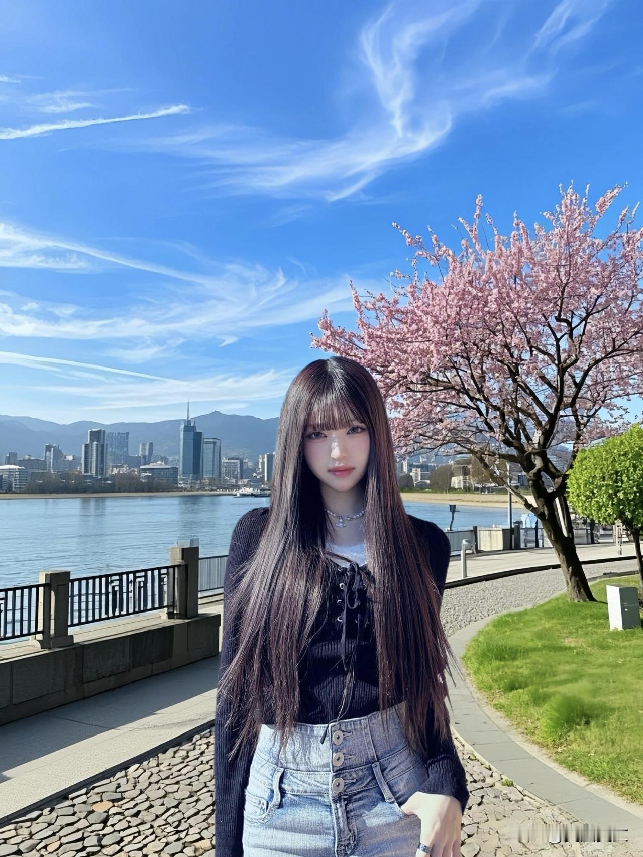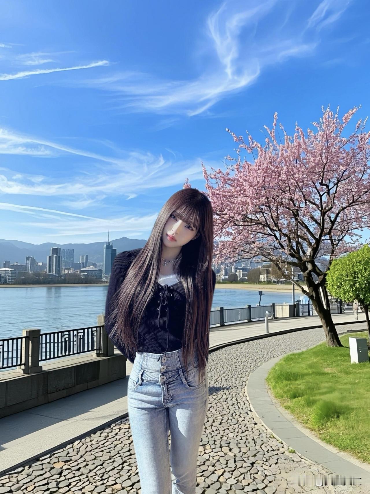 都市少女漫步河畔,时尚穿搭尽显青春活力