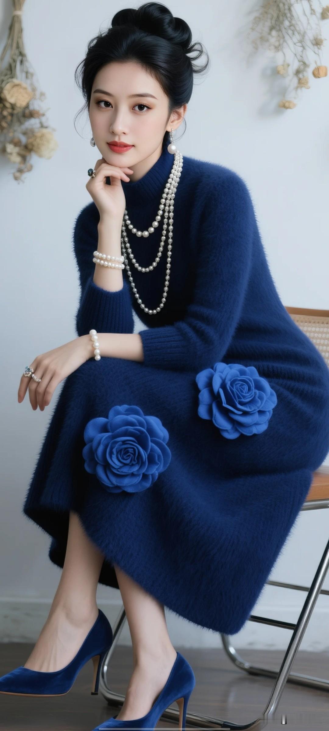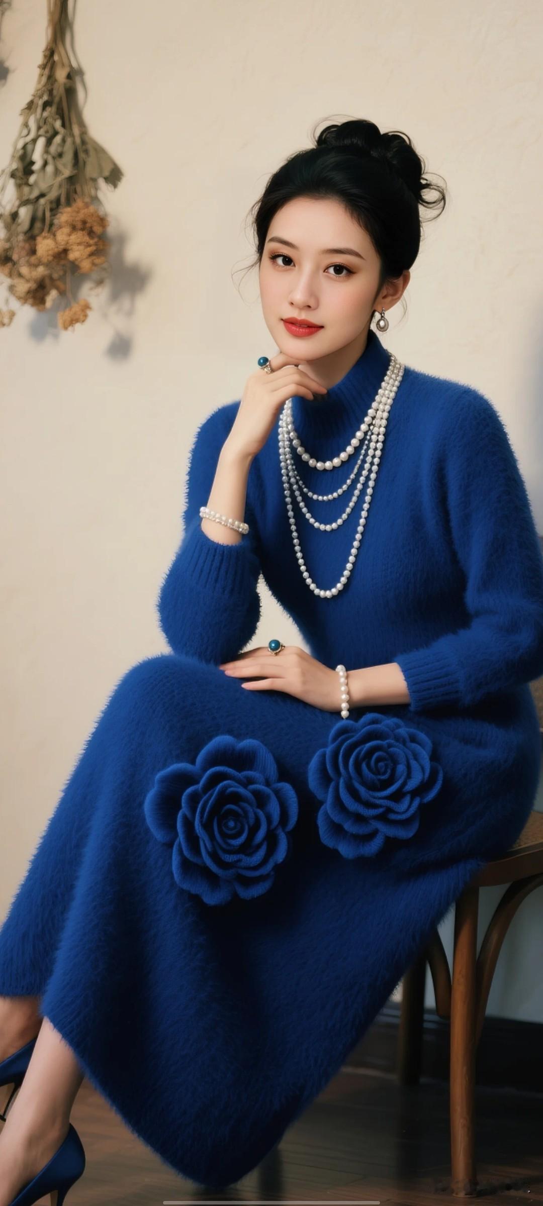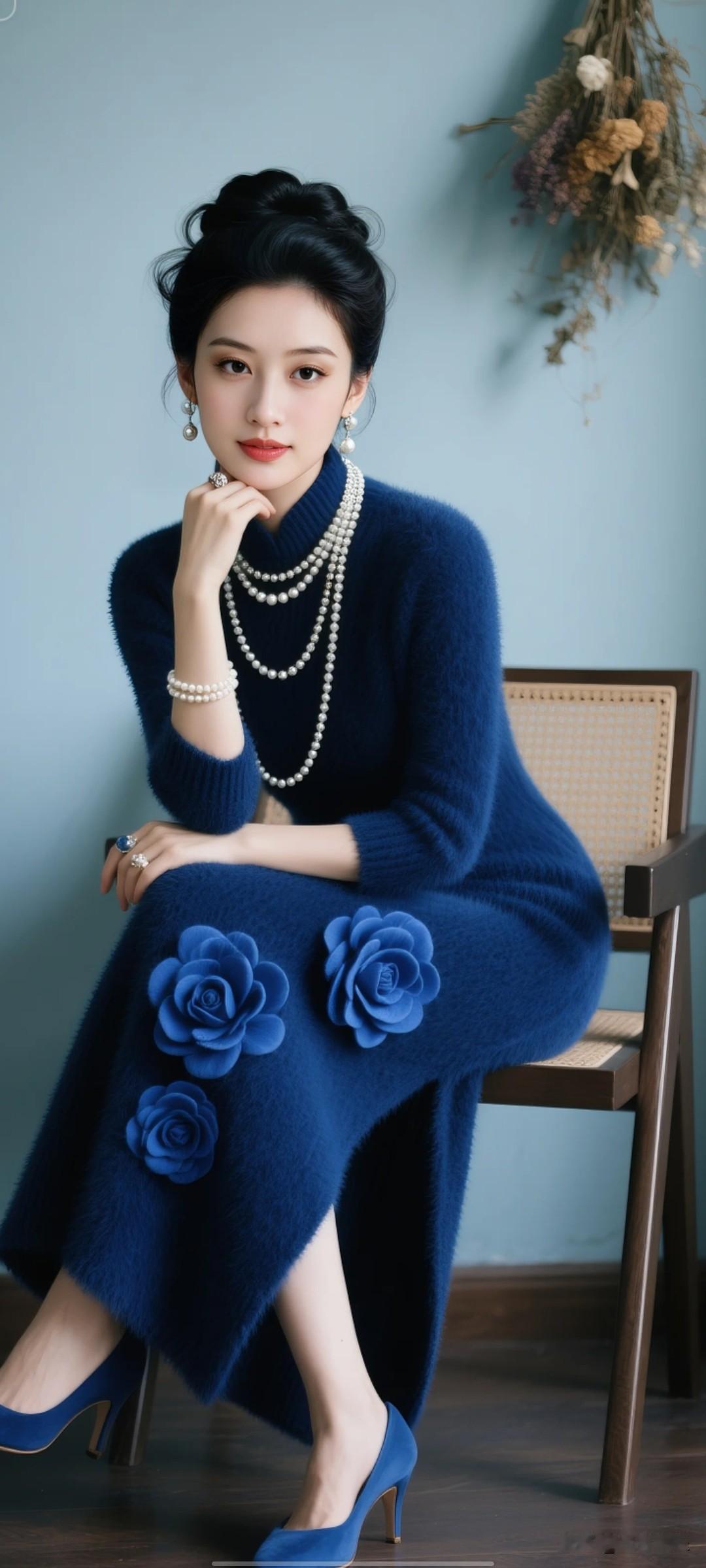 她嘴角轻扬,冷白皮,鹅蛋脸,大眼睛,眼神妩媚温柔,呈现出温婉的微笑,眼神平和且带着从容的笑意,手部轻托下巴的姿态增添了优雅与恬静的气质,整体神情显得端庄、温柔又自信凳坐在椅子上。 背景 墙上挂着干花装饰 高清影视级别全身照知性美女穿搭分享