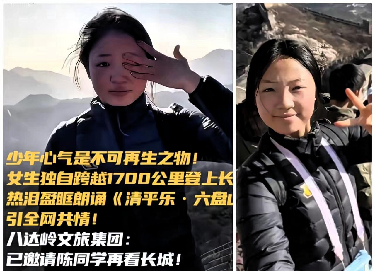 面相还真是一门玄学, 不信你看长城哽咽诵诗的陈欣妍, 给人的感觉端庄大气,从小就是一副家国情怀的长相。 19岁的陈欣妍,是湖南第一师范学院体育教育专业的大四学生。她早就对“不到长城非好汉”这句话心驰神往,元旦前夕,她独自跨越1700公里从湖南来到北京,登上了心心念念的八达岭长城。 站在蜿蜒的长城之上,望着眼前连绵的群山,她决定录制一段朗诵《清平乐·六盘山》的视频,为这场旅行画上圆满的句号。可朗诵刚一开始,她就因为心情太过激动,几度哽咽,泛红的眼眶和微微颤抖的声音,没有半点刻意,却格外打动人。 网友说“也许是诗里的山河太辽阔,大到单薄的身体一时装不下”,这话特别贴切。她笑起来脸上还带着稚气,眼神却格外坚定,这份对山河的热爱,不是空泛的口号,而是发自内心的赤诚与敬畏。 总有人觉得家国情怀是宏大的概念,离普通人的生活很远,可陈欣妍的经历恰恰说明,这份情感就藏在日常的向往里,藏在亲身触碰历史与山河的瞬间里。她只是一个普通的大学生,却用最真实的反应,展现了年轻一代该有的模样。