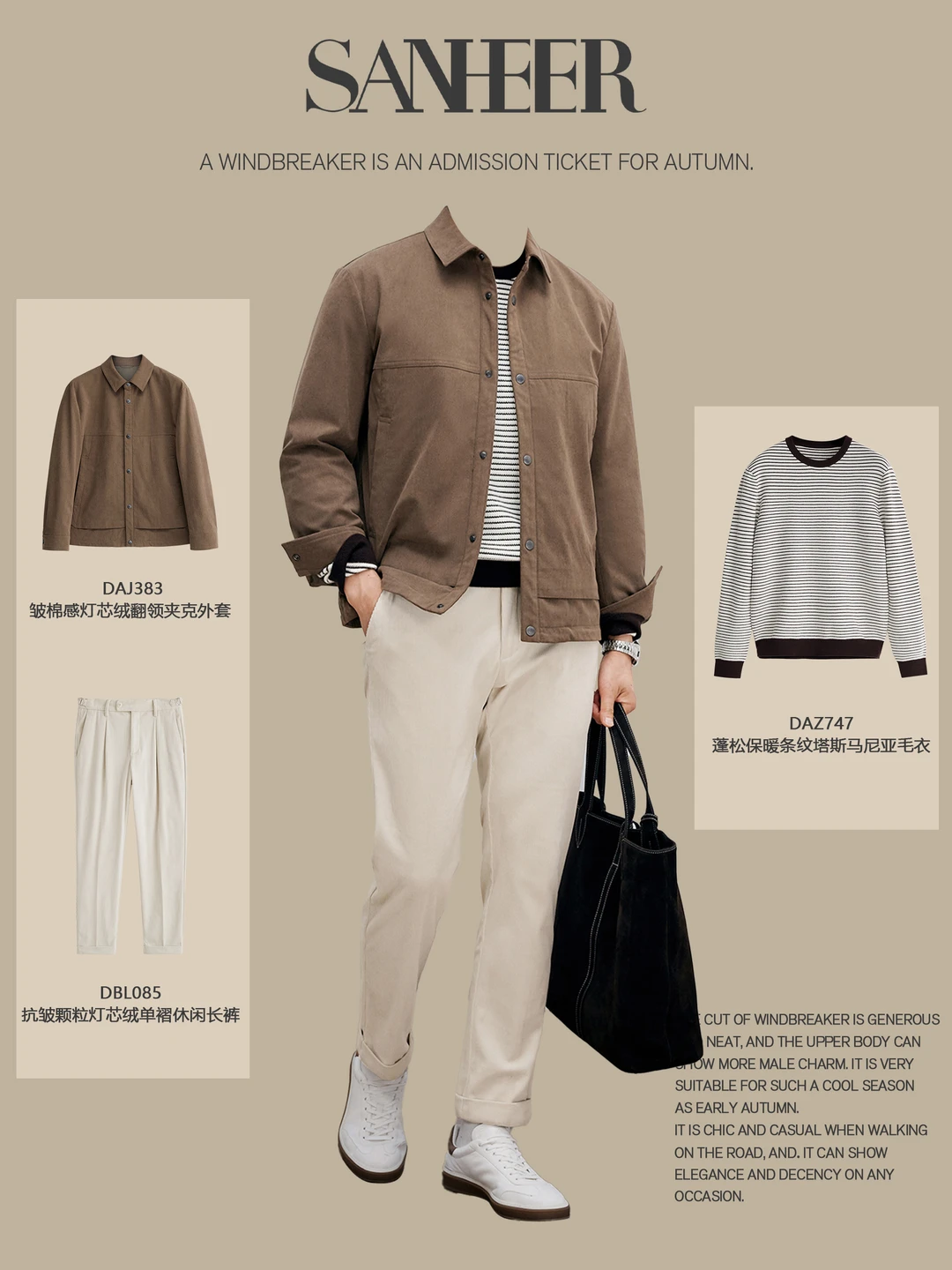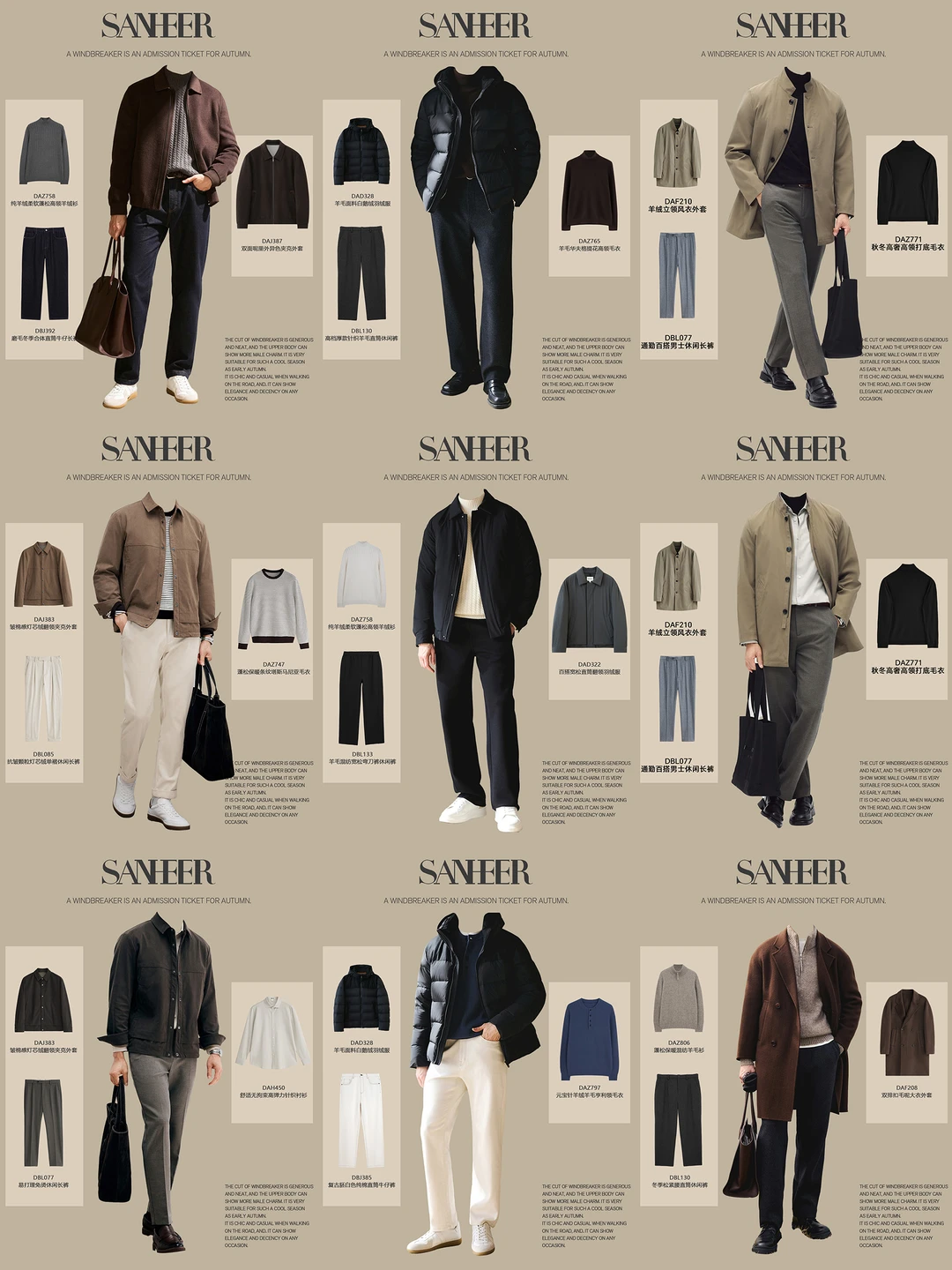 休闲夹克:棕 / 卡其款搭针织 + 垂顺裤,挽起袖口显随性,周末咖啡局直接穿;