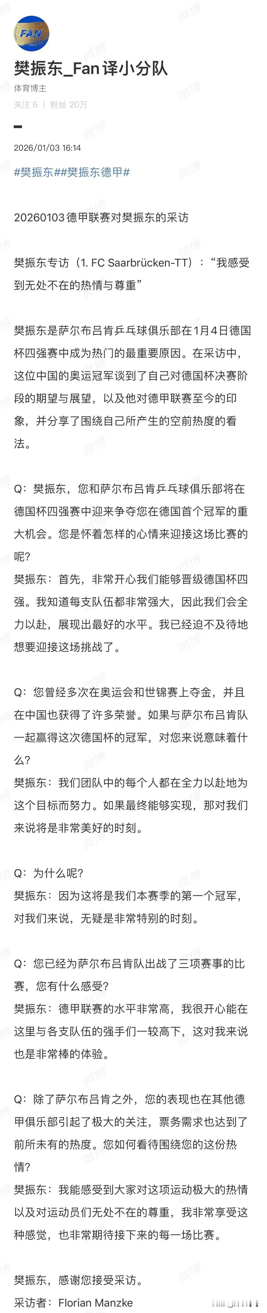 20260103德甲联赛对樊振东的采访,其中樊振东的这句话,让我非常动容。 记者问:除了萨尔布吕肯之外,您的表现也在其他德甲俱乐部引起了极大的关注,票务需求也达到了前所未有的热度。您如何看待围绕您的这份热情? 樊振东说:我能感受到大家对这项运动极大的热情以及对运动员们无处不在的尊重,我非常享受这种感觉,也非常期待接下来的每一场比赛。 由衷地开心,东哥在萨尔布吕肯是非常享受球迷的热情和尊重的,是期待比赛的,而不是像之前接受香港媒体采访时说的想躲到屋子里去的。 所以说,当初你勇敢选择德甲赛场是正确的,希望这里的热情与尊重,能够抚慰你对这项运动最真挚最深沉的热爱。 东哥一直以来都很喜欢赛场上热烈有序的氛围,喜欢人声鼎沸的阳间赛场,喜欢纯粹竞技体育氛围。愿真正热爱体育的人迎来清朗的明天! 樊振东,明天德国杯加油!