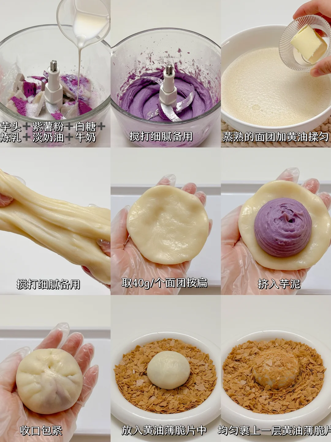 3️⃣蒸熟的面团趁热加入黄油揉匀,反复拉扯面团更Q弹,取40g/个面团按变,挤入芋泥,收口包紧整理成圆球状,表面均匀裹上一层黄油薄脆片。