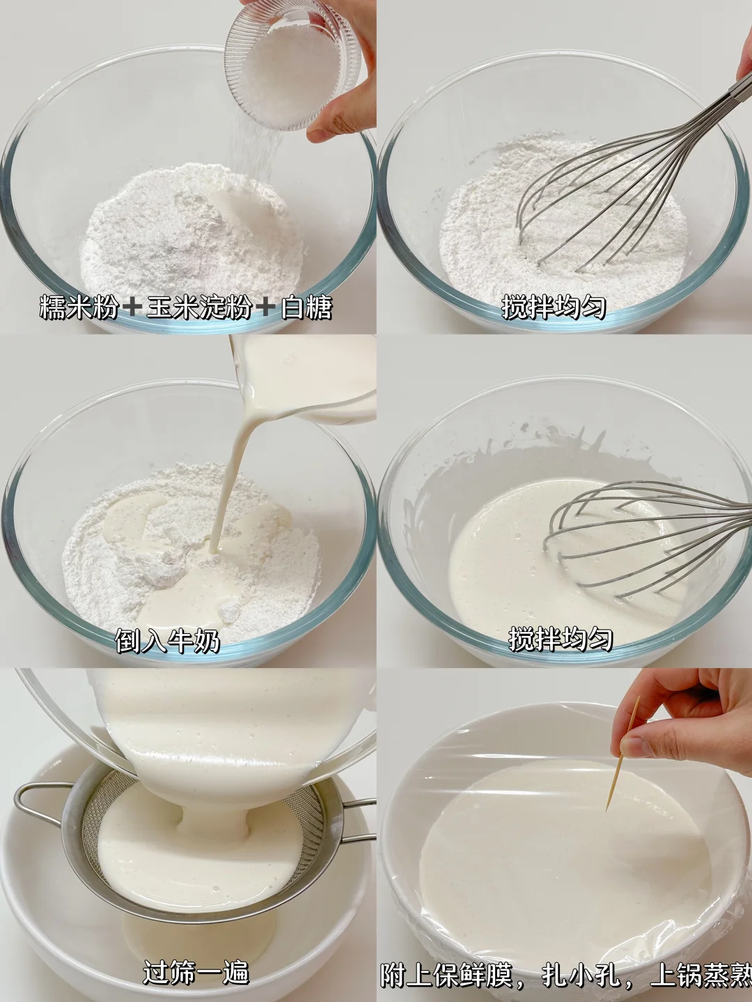 1️⃣糯米粉+玉米淀粉+白糖搅匀,倒入牛奶搅拌均匀,过筛一遍,附上保鲜膜,扎几个小孔,上锅蒸25分钟左右。