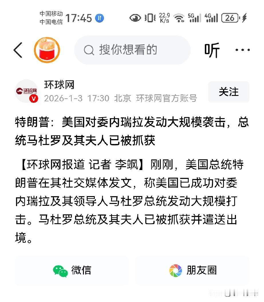 美国总统特郎普宣布:美国对委内瑞拉发动大规模空袭,已经抓获马杜罗以及夫人,并带离委内瑞拉! 执行此次行动的是美国三角洲特种部队! 美国轰炸委内瑞拉是个幌子,声东击西,真正目的抓获马杜罗! 这个新闻震惊全世界!空袭没几个小时,就抓获了马杜罗!这对美国来说无疑是非常成功的一次军事行动! 美国这次内外联手,不然的话不会这么快! 看来美国是酝酿很久,以迅雷不及掩耳之势,快速解决委内瑞拉问题! 美国不给其他国家反应的机会,等待其他国家反应过来,委内瑞拉的问题就已经解决了!