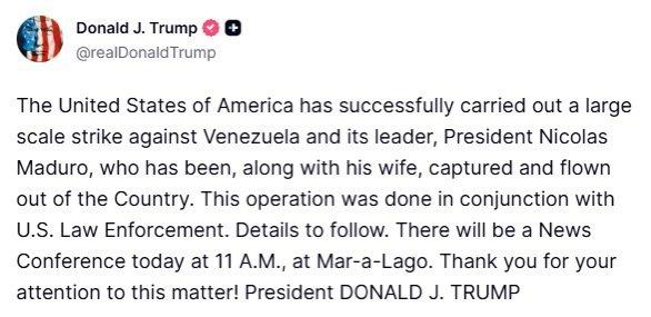 突发重大新闻,特朗普社媒发文! 川普宣布,美军突袭行动结束,已抓获委内瑞拉总统马杜罗及其妻子。 川普说美国时间今天上午11点,将在海湖庄园举行新闻发布会公布详情。从看到突袭行动到川普宣布消息,时间仅不到5个小时。 如果真如川普所言,只能说明马杜罗身边早已通美,并且提供了详尽的位置情报。现在很难判定事情真伪,大家说会是烟雾弹么?