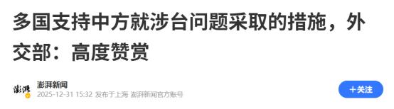现在我们陷入了一个怪圈!2025年12月31日,针对多国支持中方就台湾问题采取的措施,外交部作出表态! 就在2025年最后的时间段里,我国对台举行了重大的军事演习。此次军事演习的规模空前盛大,这场军事演习的目的,我国毫不避讳的表示。 此次军事演习就是为了向台独分子发出警告,同时再次警告外部势力不允许干涉中国的内政。当我国展开这一军事演习后,俄罗斯,古巴,塞尔维亚等多个国家纷纷表示支持。 此事引起国际高度讨论,在2025年12月31日的时候。外交部例行记者会议中,就有记者提问如何看这些国家的支持? 对于这一提问,外交部发言人表示高度赞赏。同时再次强调台湾是中国领土不可分割的一部分,台湾问题是中国内政反对任何形式“台独”! 在外交方面,外交部再一次捍卫了中国主权。但不知大家是否敏锐的察觉到,现如今我们似乎陷入了一个自证的怪圈。台湾本就是中国的,但我国一直在让其他国家承认。 根据历史文献记载,台湾早就是属于中国。但又因历史因素的影响,台湾曾被日本殖民。以至于当新中国成立之后,台湾内部出现了严重的分裂势力,但这并不意味着台湾不属于中国。 所以针对台湾问题,我国完全可以态度非常强硬的去表达中国的立场。但与之不同的是,我国一直在反复的三令五申警告其他国家。而之所以会出现这一情况,或许是因为国家并不希望通过流血牺牲,来换回真正的祖国统一。 对此,您怎么看?欢迎评论区留言您的观点,我们一起讨论一下。 (信息来源:多国支持中方就涉台问题采取的措施,外交部:高度赞赏-澎湃新闻)
