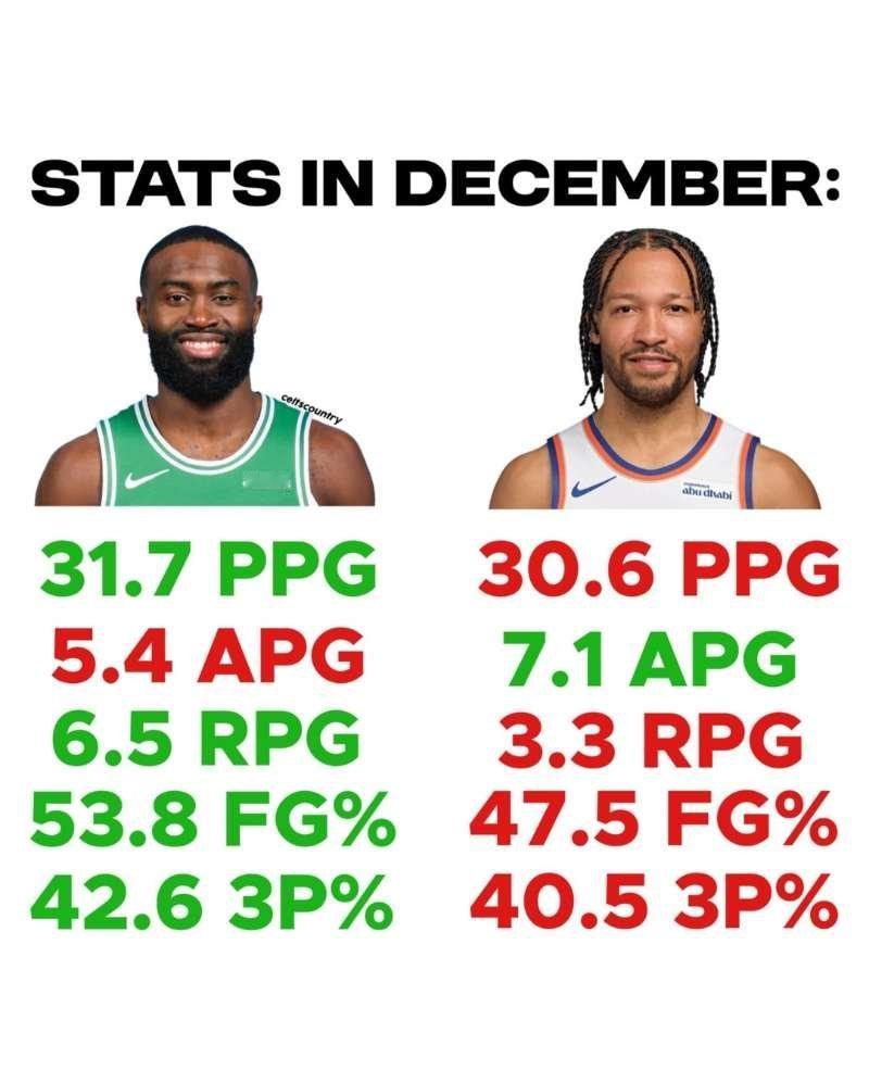 12月份,杰伦与布伦森的数据对比,目前凯尔特人整体战绩落后尼克斯1.5个胜场。那么问题来了,谁更配得上这个月最佳?NBA月最佳凯尔特人热爱日记