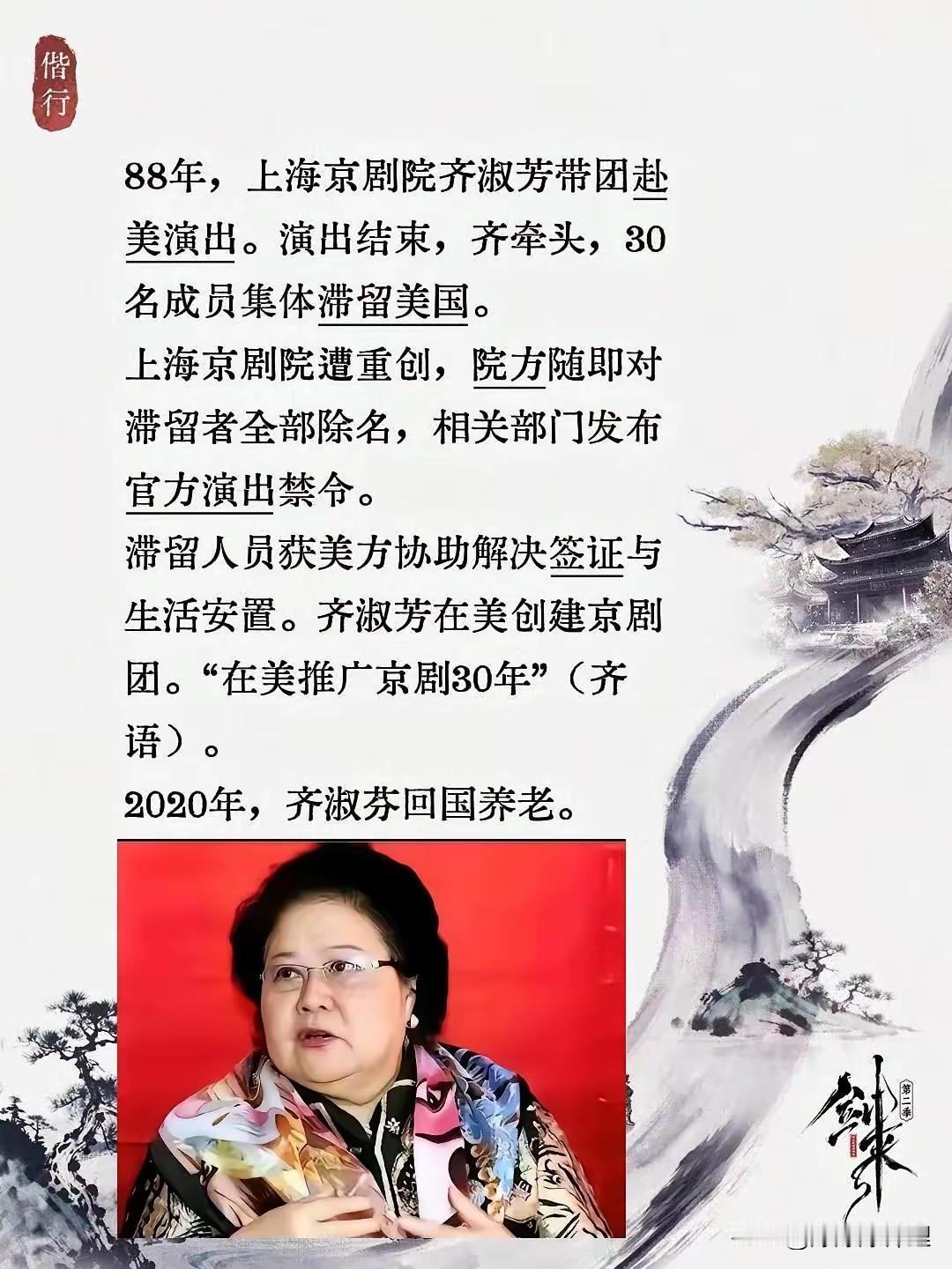 1988年那会儿,上海京剧院真的是倒了大霉。 那是齐淑芳带队去美国演出,结果大幕一落,人不见了。 这不是一个人跑路,是带着30多号顶尖的角儿“集体滞留”,这是把老东家的根都给刨了啊! 当年院里气得没办法,只能把这帮人全除名,连官方禁令都发了。 在那边混了30多年,嘴上说着是“海外推广国粹”,怎么到了2020年,身子骨不行了又想起来回国养老了? 合着年轻时候的力气全卖给老美了,这时候回来享受国内的医疗和安稳? 这算盘打得,隔着太平洋都能听见响声。 我就想问问,这种“精致利己”的操作,让当年那些坚守在国内熬苦日子的老艺人们心里怎么想? 真就是好处全让一个人占完了。