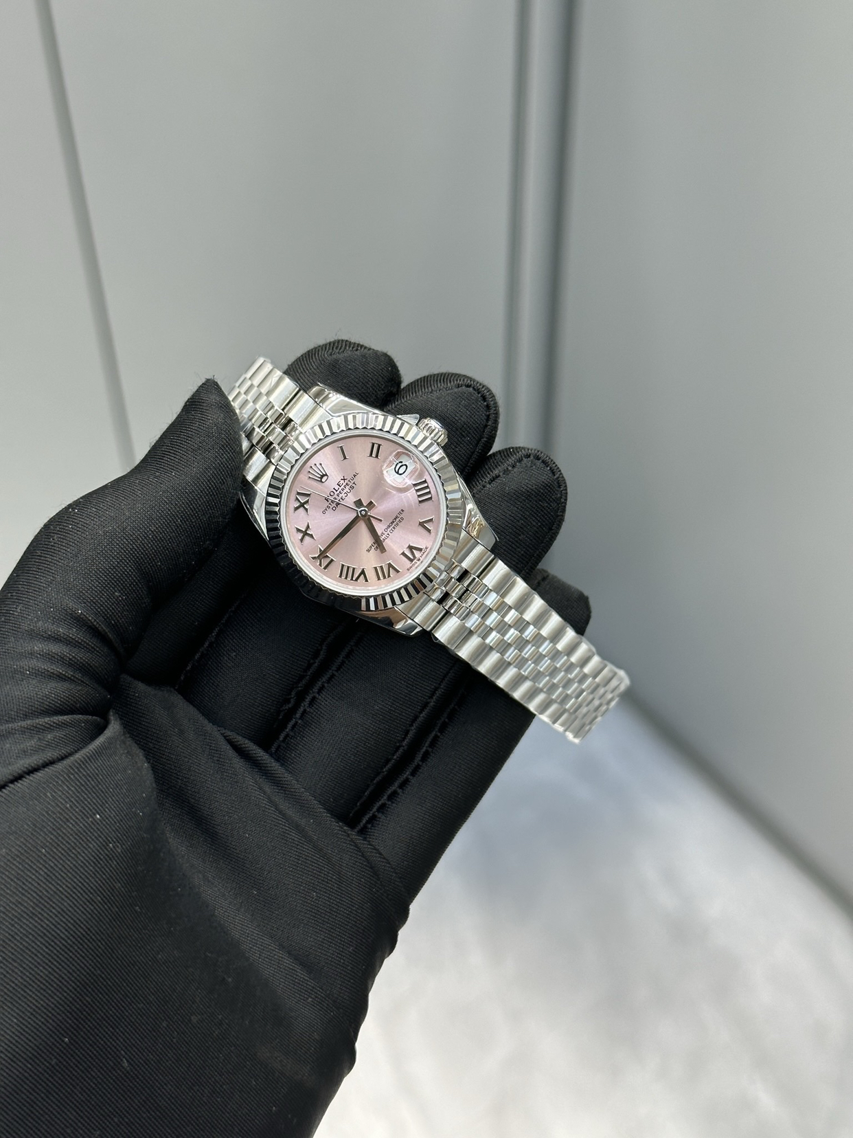 36毫米的经典蚝式表壳内,粉色的表盘如同一幅极简画作。标志性的三角坑纹外圈守护着时间的秘密,罗马数字时标与修长的指针在粉底色上勾勒出清晰的时间轨迹。三点钟位置的水滴形日历窗,是劳氏日志系列不变的签名。