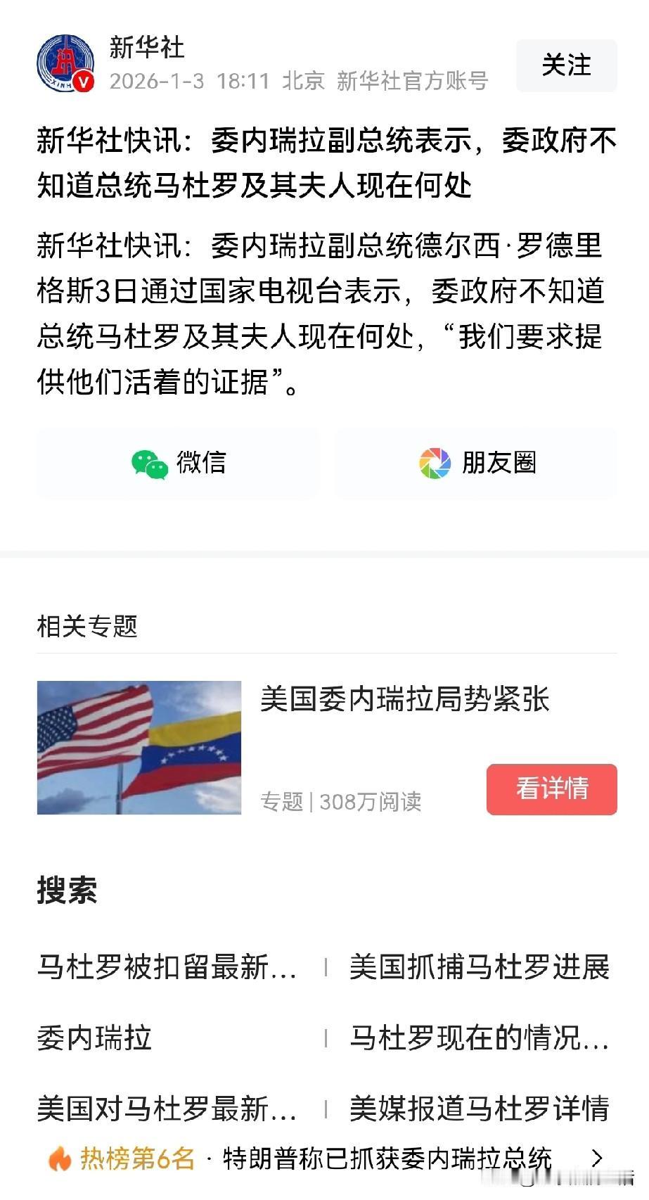 委内瑞拉全民抵抗正酣的时候,突然发现总统不见了,并且生死不明! 美国趁着委内瑞拉人民在睡觉的时候发起轰炸! 轰炸了一个多小时,总统和总统夫人就不见了!马杜罗身边是有多少奸细,能够在这么短时间内,把他们的位置暴露给对方,并且实施精准抓捕,关键是还没有惊动委内瑞拉的防卫。 副总统要要求美国提供总统马杜罗和他夫人活着的证明。 这可能是2026年最魔幻的开篇了,总统刚宣布完要保护自己的家园,话音未落,整个国家都不知道总统和他夫人现在在哪里,甚至生死未卜。 委内瑞拉境内储藏的大量石油,并且不顾一些西方国家的警告,执意通过各种途径,也要把石油卖给东大。 只是没有想到,他们比当年的伊拉克还悲惨,在毫无征兆的情况下,重要港口和军事设备都被轰炸了,并且只用了一个多小时。 弱国不但没有外交,更是连最基本人权都没有,只能任由大国欺凌,强军不是穷兵黩武,而是为增加一份自保能力罢了。 现在我们的处境已经很危险了,周边国家不但虎视眈眈,还经常制造摩擦,和我们走的比较近的国家,总是被一些霸权国家以莫须有的罪名来进行“制裁”。 这个世界,永远都是弱肉强食,不要祈求别人会放过你。