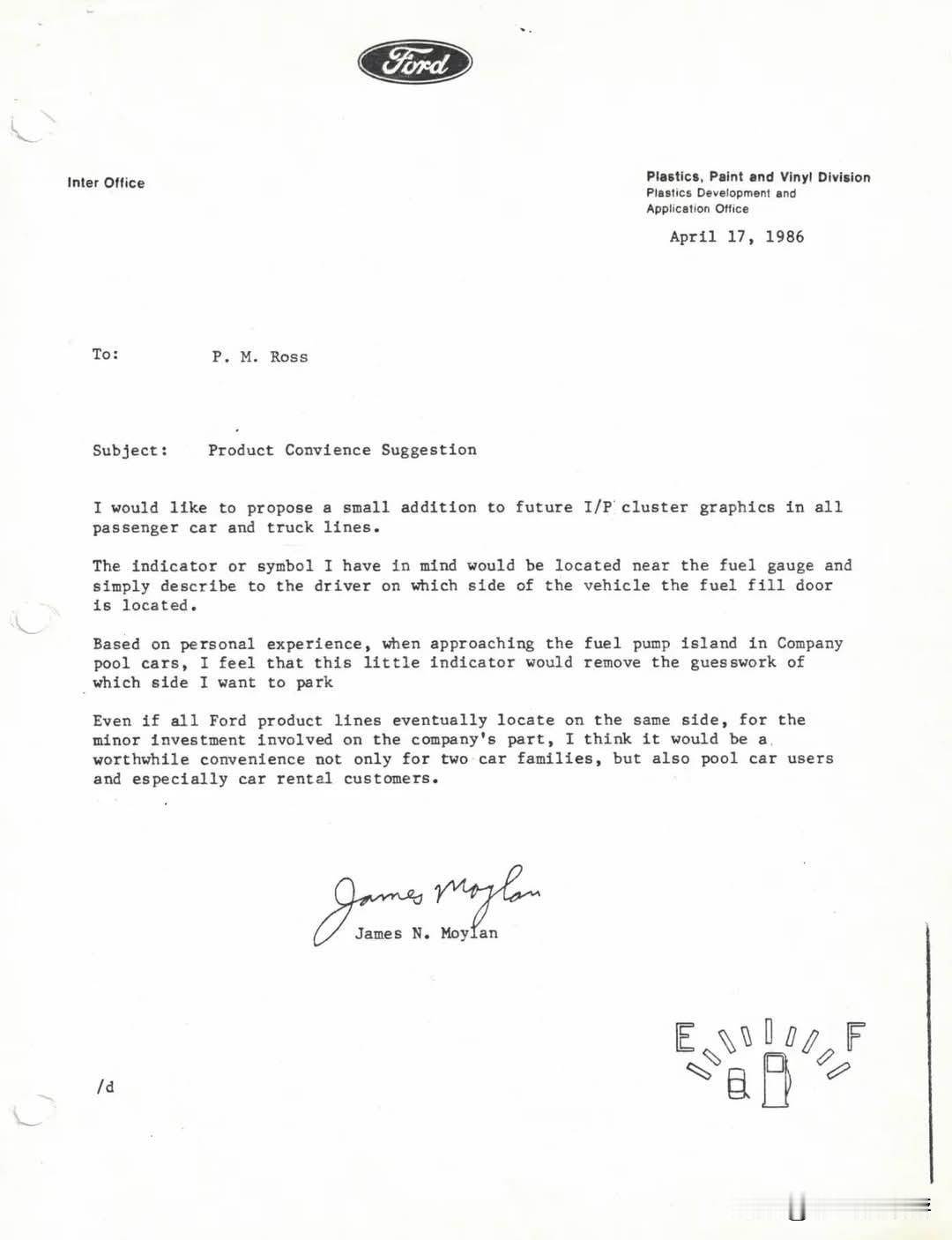 40多年前的一个下雨天,福特公司的工程师莫伊兰在公司园区开车去参加会议。途中,他发现汽车燃油即将耗尽,便顺势驶入加油站。然而,他停车时却停在了油枪的另一侧,结果被雨水淋得浑身湿透。 换做大多数人,遇到这种情况可能只会满心懊恼,但莫伊兰当时就思考:为什么汽车仪表盘不能直接告知油箱在哪一侧呢?回到办公室后,他连外套都没来得及脱,就赶忙写了一份备忘录。在备忘录里,他提议在所有车型的油量表旁边,添加一个小小的方向箭头,这样驾驶员一眼就能知道该把车停在哪边加油。 这个看似毫不起眼的创意,很快就被福特公司采纳。短短几年间,整个汽车行业纷纷效仿。最终,油箱方向箭头成为了全球几乎每一辆汽车的标配。 这个小小的油箱方向箭头,影响了数十亿人的日常生活,但其发明者莫伊兰却长期默默无闻。他既没有为这个创意申请专利,也没有要求任何报酬或署名,仅仅是单纯地想解决生活中的小麻烦。 直到多年以后,媒体在整理福特公司档案时,翻出了那份1986年的备忘录,莫伊兰才首次被公开提及。至此,外界才知晓这个平日里被大家忽视的小符号,源自一位愿意在细节上多思考一步的工程师。 这并非是那种能改变世界的重大科技发明,却给人类带来了实实在在的便利。真正了不起的创新,有时候仅仅是悄然消除了大家生活中的细微不便。