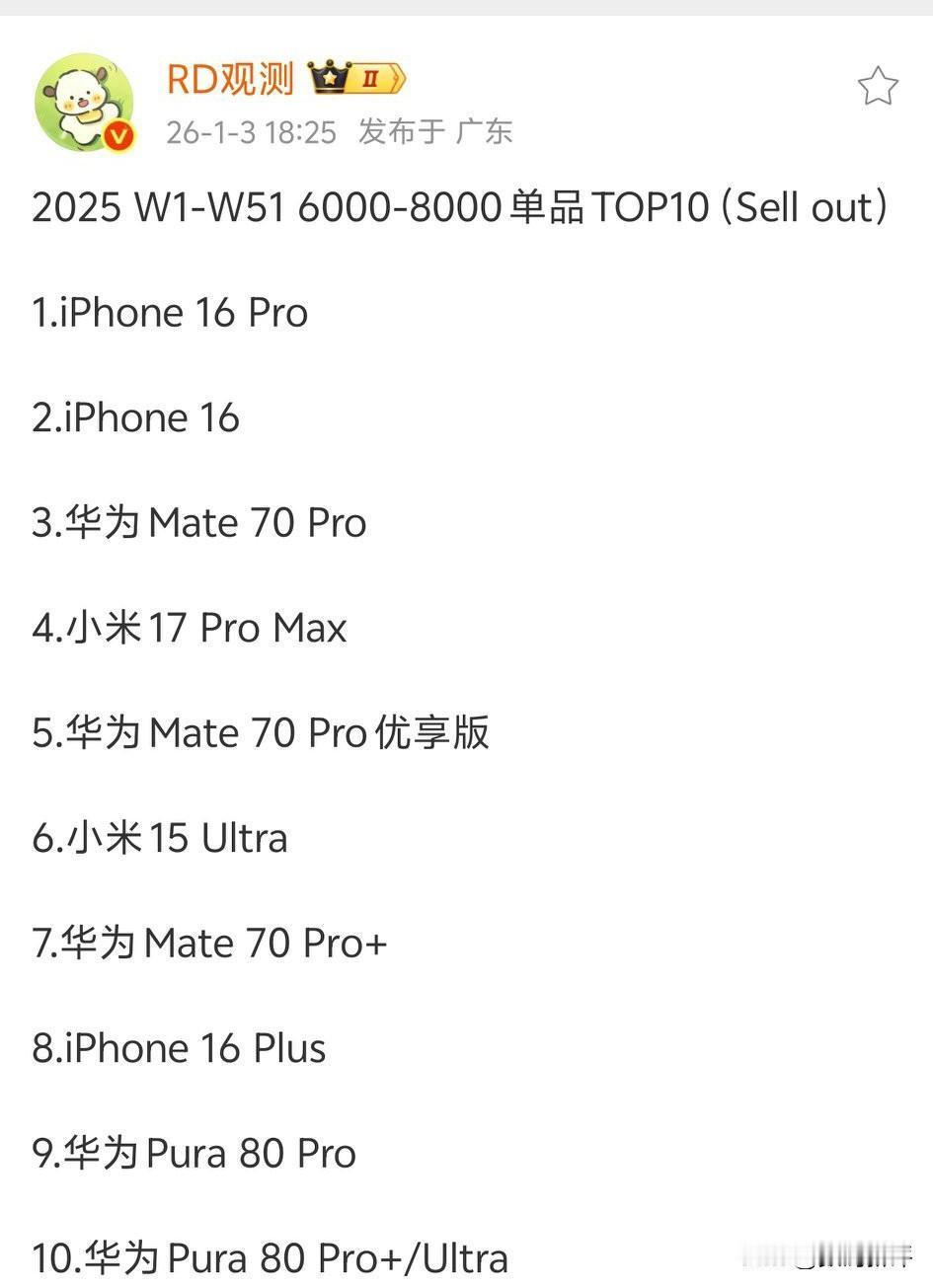 25年高端手机销量排行[灵光一闪]起步价来到6K左右了,前两名是苹果的16系列,华为mate70Pro冲到第三名!小米17Promax卖了两个多月居然也有第四名,销量确实强啊[笑哭]第五名mate70Pro优享版,后期降价只用3999左右了,第六小米15Ultra,友商的Ultra销量确实一般,而苹果的Pro max不在这个区间,没有上榜