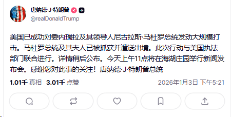 特朗普最新发帖声称,委内瑞拉总统马杜罗及夫人已经被抓获并遣送出境,意思是已经被送往美国。真如此,委内瑞拉马杜罗政权的不堪一击程度也是创了现代战争记录的。 简直滑稽呵。 #特朗普下令打击委内瑞拉境内目标#
