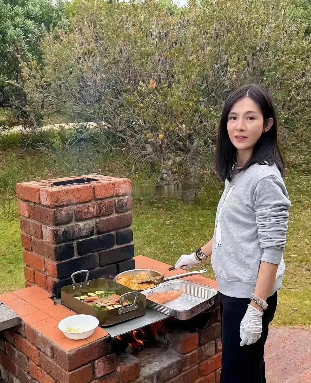 51岁杨采妮与老公、双胞胎儿子在新加坡家中户外烧烤,她状态年轻气质佳,孩子们帮忙分担,一家人共享烟火生活,满是幸福。