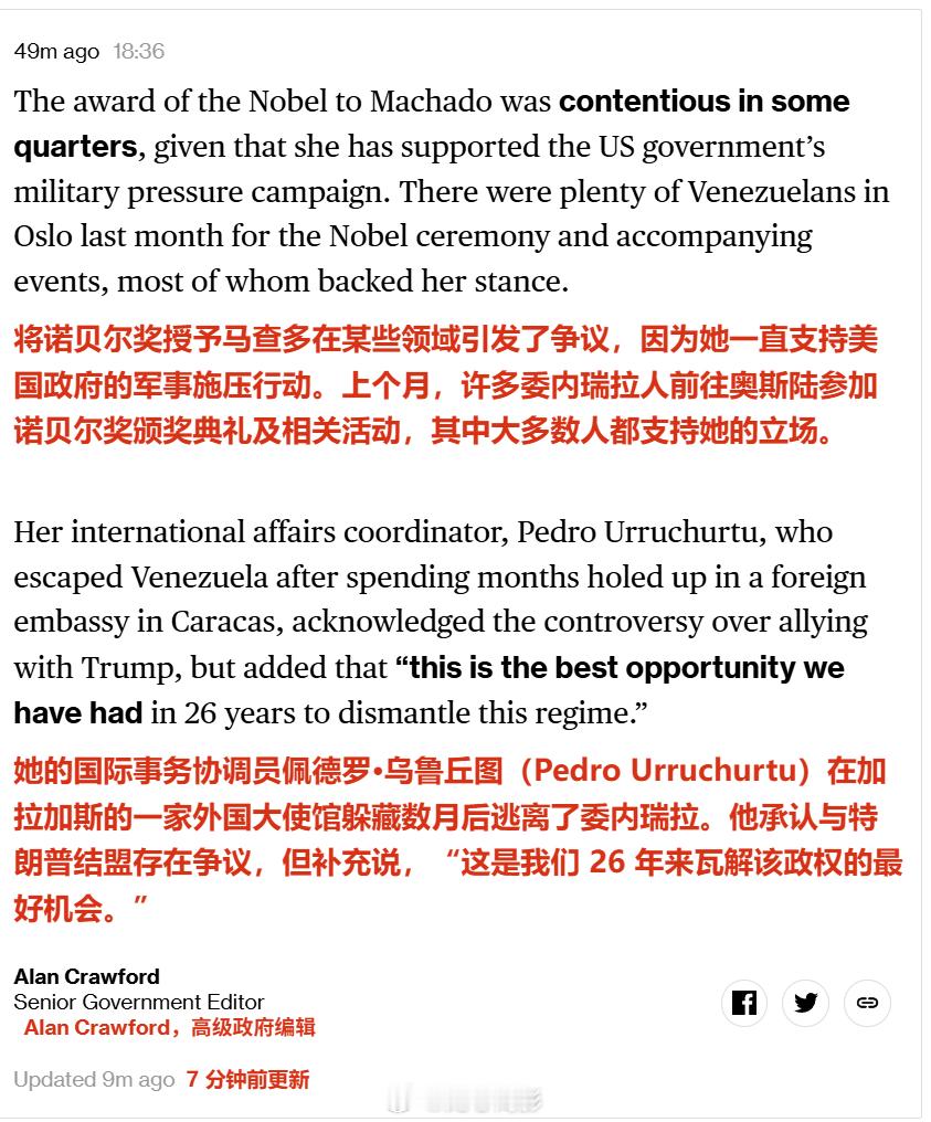 彭博社报道:诺贝尔和平奖得主、委内瑞拉反对派领导人马查多一直支持美国政府的军事施压行动。她此前还表示:我们已准备好接管委内瑞拉政府。特朗普称已抓获委内瑞拉总统海外新鲜事