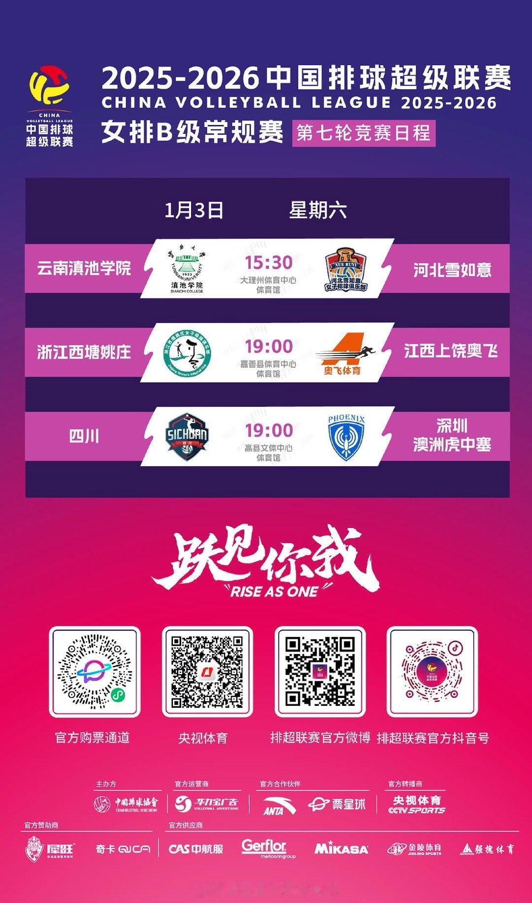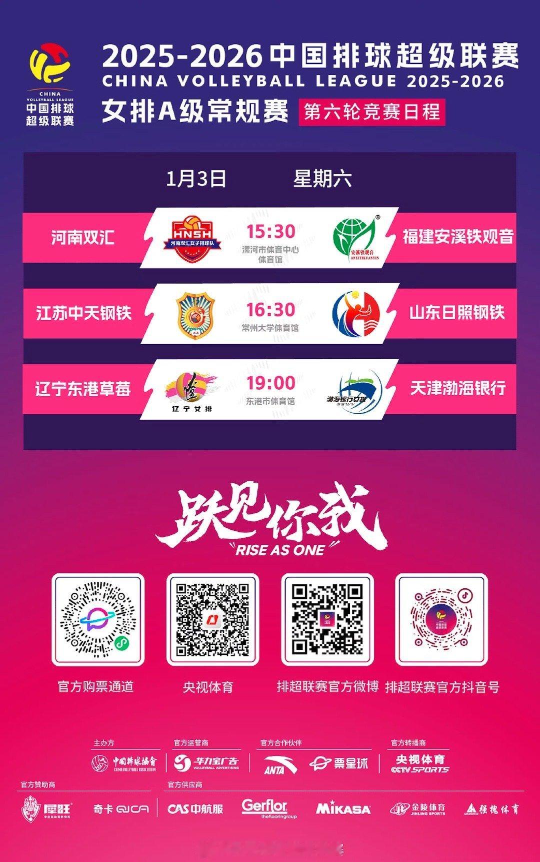 2025-2026中国女排超级联赛 女排联赛A级第六轮/B级第七轮今天继续进行:15:30 河南双汇 vs 福建安溪铁观音16:30 江苏中天钢铁 vs 山东日照钢铁19:00 辽宁东港草莓 vs 天津渤海银行 15:30 云南滇池学院 vs 河北雪如意16:30 浙江西塘姚庄 vs 江西上饶奥飞19:00 四川女排 vs 深圳澳洲虎中塞