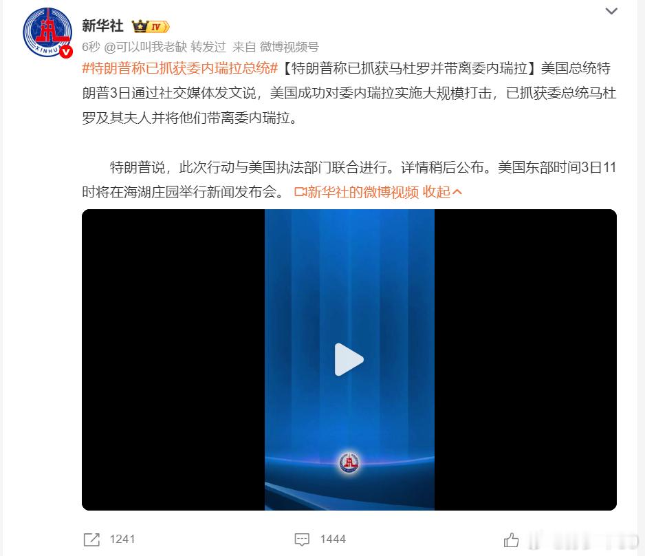 美国总统特朗普3日通过社交媒体发文说,美国成功对委内瑞拉实施大规模打击,已抓获委总统马杜罗及其夫人并将他们带离委内瑞拉。这是真的斩首行动特朗普称已抓获委内瑞拉总统
