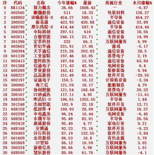 算力概念,2025年以来涨幅最多的名单 算力概念:今年涨幅 +36.66%,本月涨幅 -0.87% 顺灏股份:今年涨幅 +511.00%,最新价 18.33元,本月涨幅 +128.27% 沐曦股份-U:今年涨幅 +454.27%,最新价 580.10元,本月涨幅 +454.27% 新易盛:今年涨幅 +423.93%,最新价 430.88元,本月涨幅 +23.89% 摩尔线程-U:今年涨幅 +414.44%,最新价 587.90元,本月涨幅 +414.44% 中际旭创:今年涨幅 +397.51%,最新价 610.00元,本月涨幅 +18.56% 合锻智能:今年涨幅 +246.13%,最新价 23.71元,本月涨幅 +14.99% 宏景科技:今年涨幅 +232.00%,最新价 66.30元,本月涨幅 +6.99% 世纪华通:今年涨幅 +231.91%,最新价 17.06元,本月涨幅 -5.17% 天孚通信:今年涨幅 +215.26%,最新价 203.03元,本月涨幅 +28.50% 工业富联:今年涨幅 +197.46%,最新价 62.05元,本月涨幅 +2.19% 雷科防务:今年涨幅 +187.84%,最新价 12.55元,本月涨幅 +63.84% 信通电子:今年涨幅 +171.43%,最新价 42.94元,本月涨幅 +0.40%