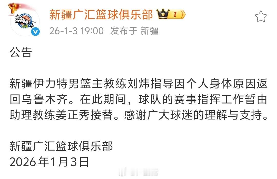 新疆男篮官宣:球队的赛事指挥工作暂由助理教练姜正秀接替。cba新疆男篮小卢篮球世界