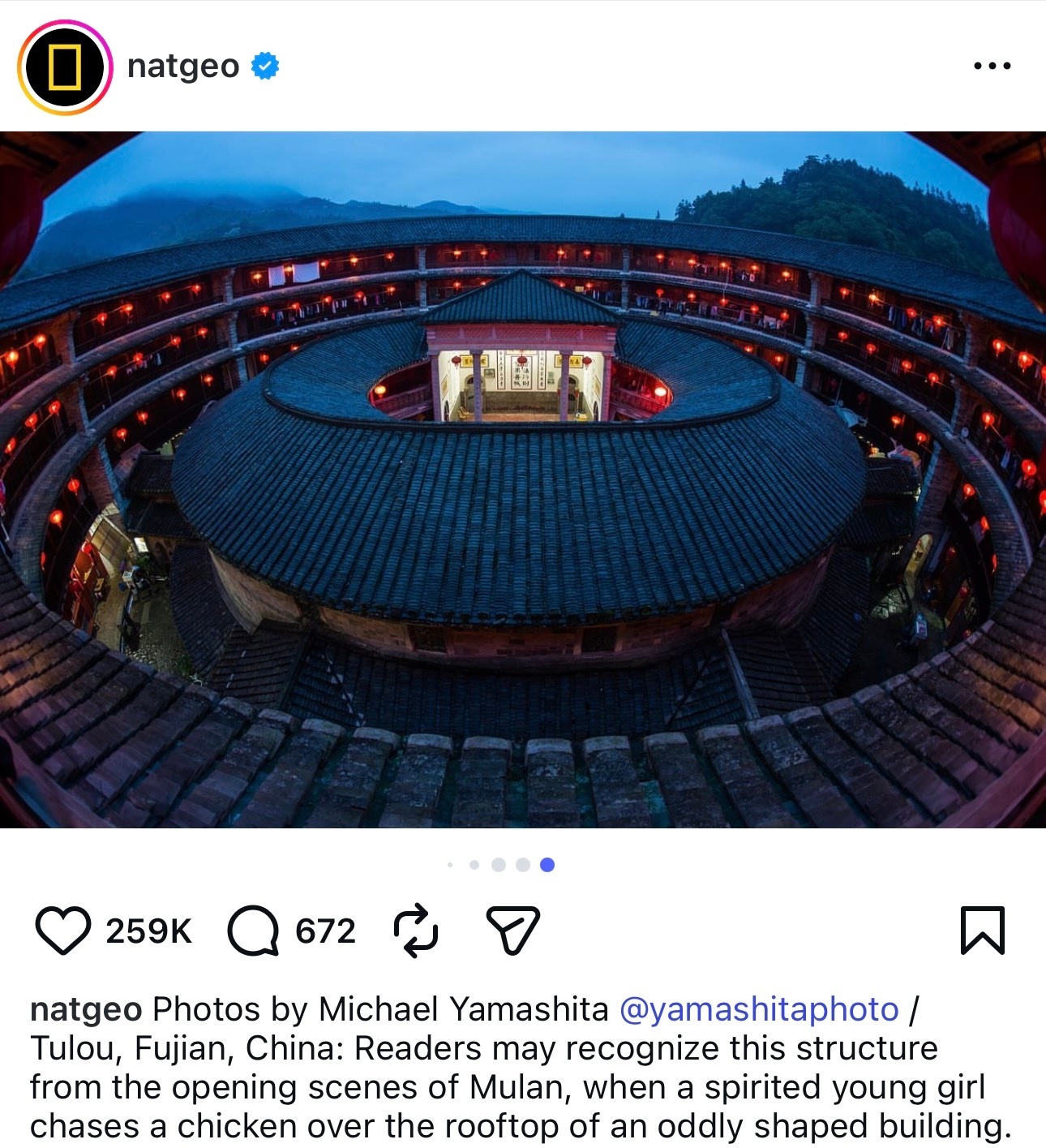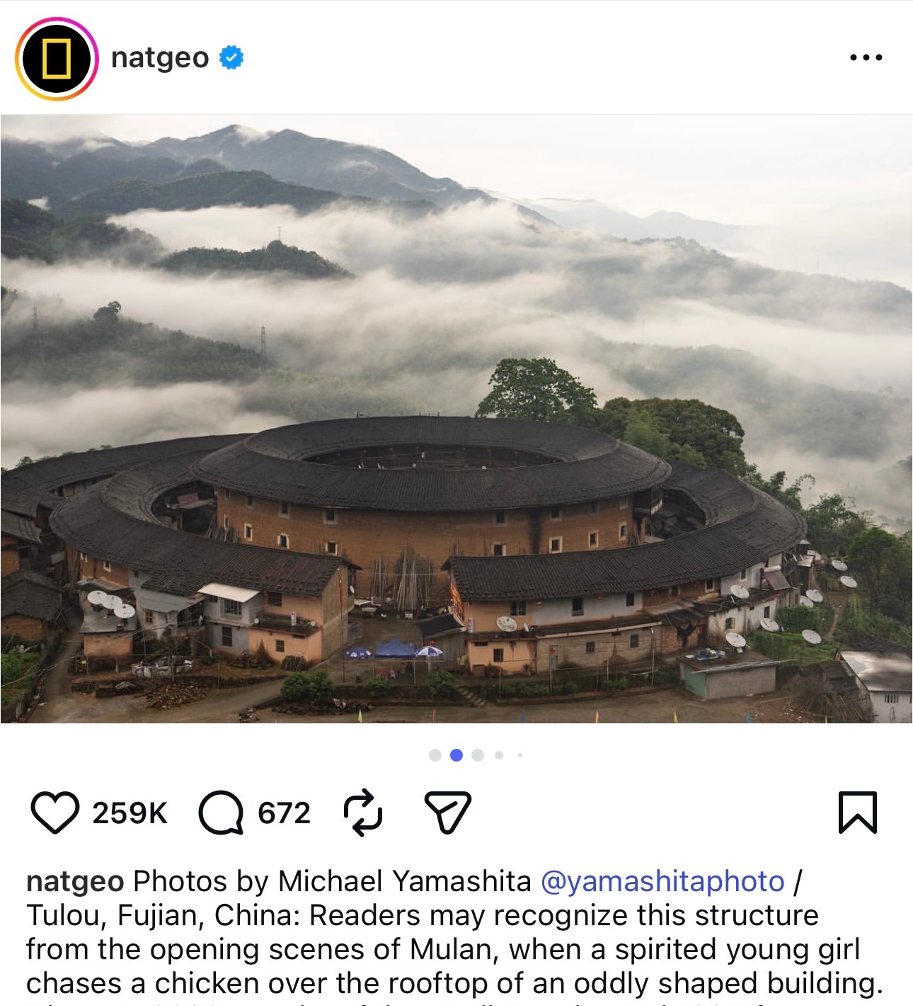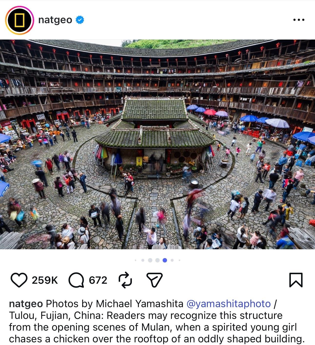 全球最有影响力的自然与地理科学杂志National Geographic国家地理杂志官方Ins在刘亦菲《花木兰》上映时还对电影里出现的福建土楼进行过介绍,还发布了摄影师曾在中国福建拍摄到的土楼照片,天仙全球大爆作品的力量花木兰